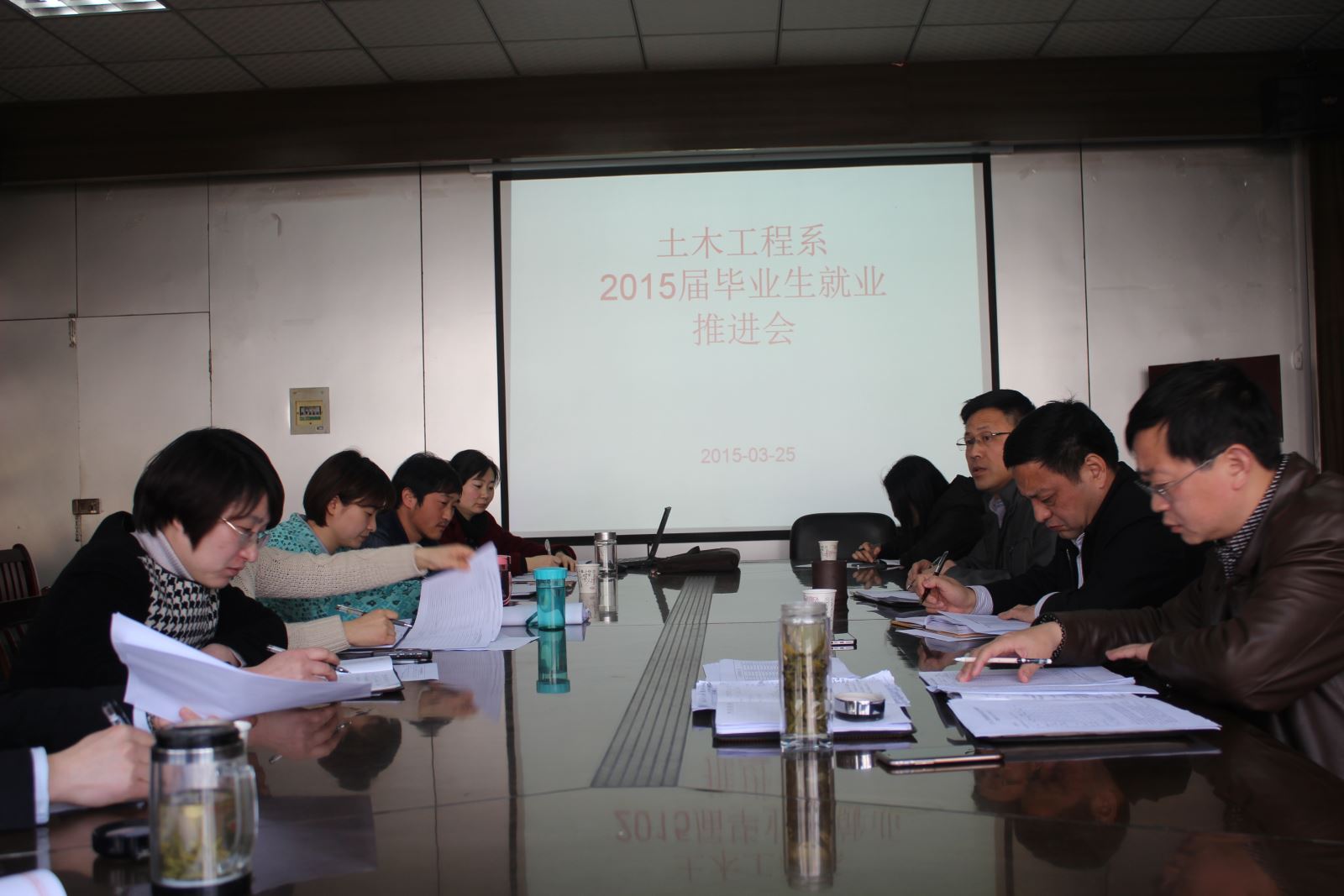 2015年3月25日下午,土木工程系2015届毕业生就业工作推进会在系会议室举行。院学生处副处长李家林(主持工作)、系党总支书记朱文胜、系主任王常才出席会议。参加会议的还有我系2015届毕业班全体辅导员。会议由系党总支书记朱文胜主持。