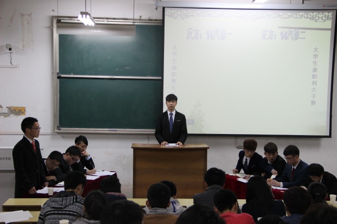 4月12日晚7:00,由汽车与机械工程系团总支学生会举办的第十二届“新月杯”大专辩论赛决赛在南区教学楼西阶101教室拉开帷幕。正方14汽修2班代表队和反方14汽修1班代表队围绕“大学生兼职利大于弊还是弊大于利”展开了激烈辩论。