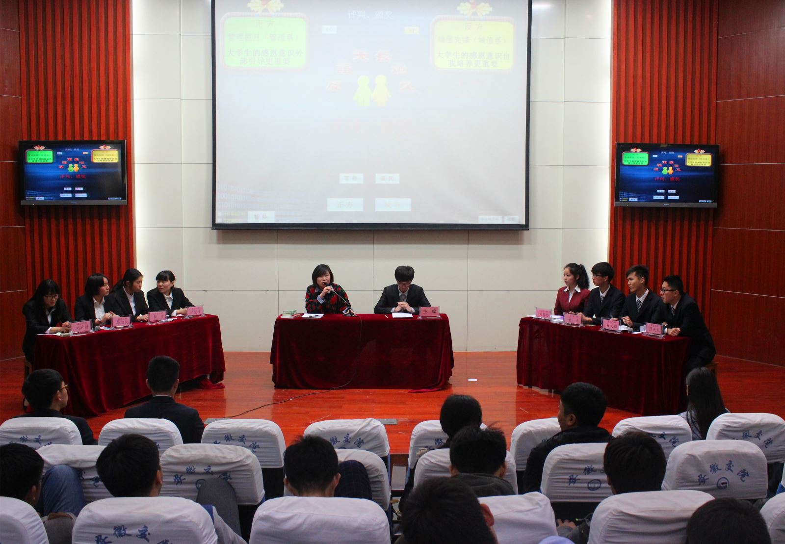 比赛的双方阵容分别是正方管理工程系张腊军老师带领的“揽月队”和反方城信系王姁老师带领的“先锋队”。双方辩手围绕“大学生的感恩意识外部引导(自我培养)更重要”这一论题展开激烈辩论。在开篇立论阶段,正方一辩张惠子同学重点阐明了外部引导尤其是学校的德育工作对激发大学生感恩意识至关重要的作用。指出只有加强外部引导与教育才能引发学生的认同共鸣,培养学生的感恩意识,激发学生的感恩情感,使学生懂得感恩是做人之本,是快乐之源,使感恩之行成为自然之举。攻辩与自由辩论环节中,双方唇枪舌剑,努力抓住对方的纰漏,为己方观点创造优势。台下反响热烈,观众提问环节各系同学踊跃发言,参与其中。 在最后的结辩环节中,反方四辩匡天胤同学再次强调了己方观点,他表示,对于大学生的感恩意识的培养外部引导是间接的,归根到底还是要通过个人的自我调节起作用。
