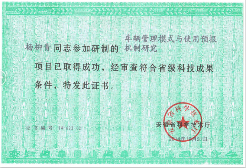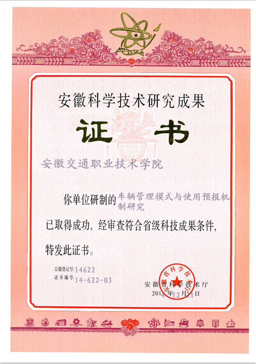 2015年1月,汽车系承担的安徽省高速公路控股集团有限公司《车辆管理模式与使用预报机制研究》项目被鉴定为安徽省“省级科技成果”。