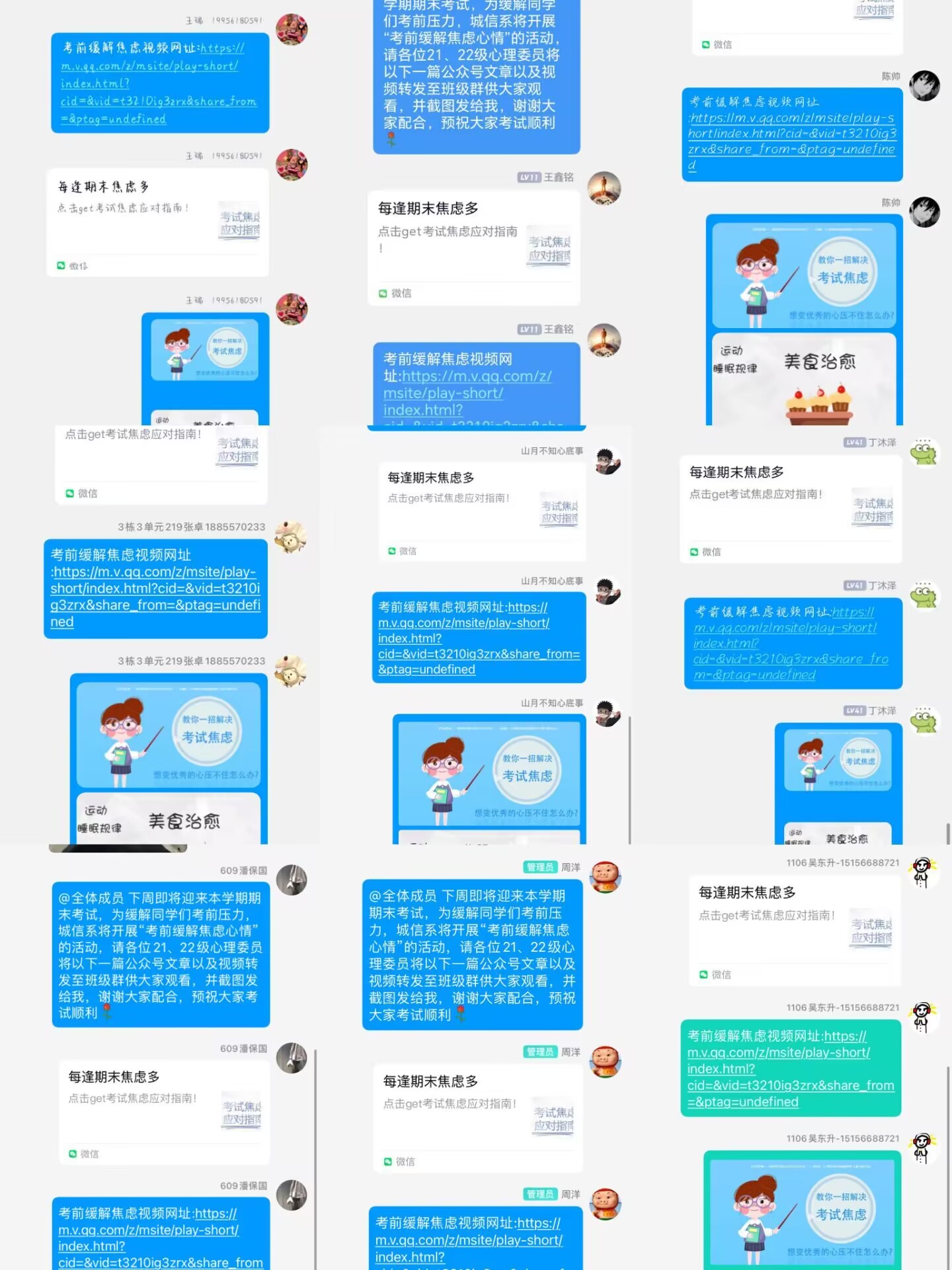 本次活动以线上观看的方式开展,王莹莹以“一文章一视频”作为活动主要内容,将活动内容传至各班负责人,再由其传至班级群供全班学生学习与观看,做到层层深入,层层递进。