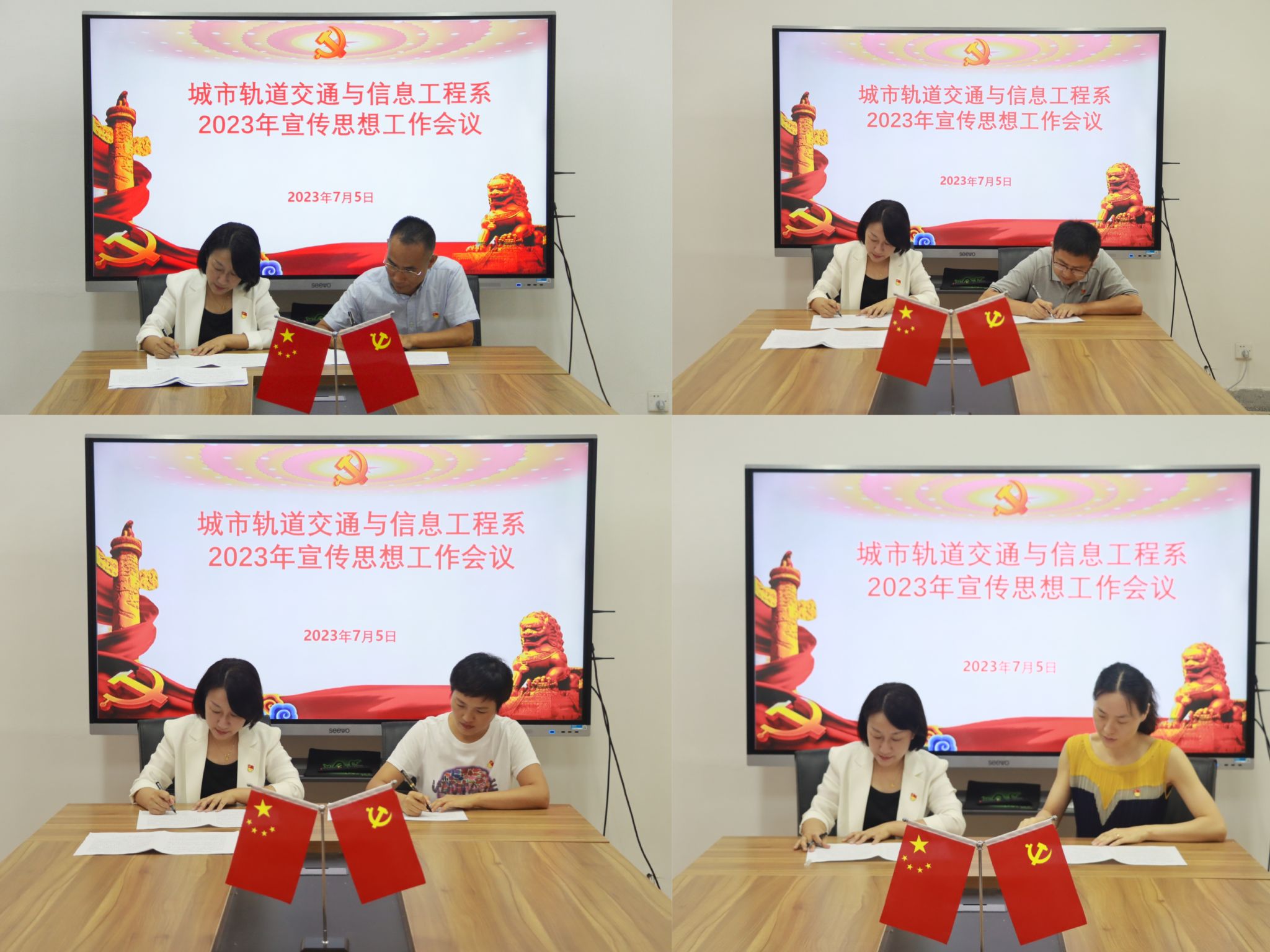7月5日下午,城信系召开2023年宣传思想工作会议。系党总支书记汪倩与下辖各党支部签订了2023年度意识形态工作责任书。会议由汪倩主持,系党总支委员、各党支部书记参会。
