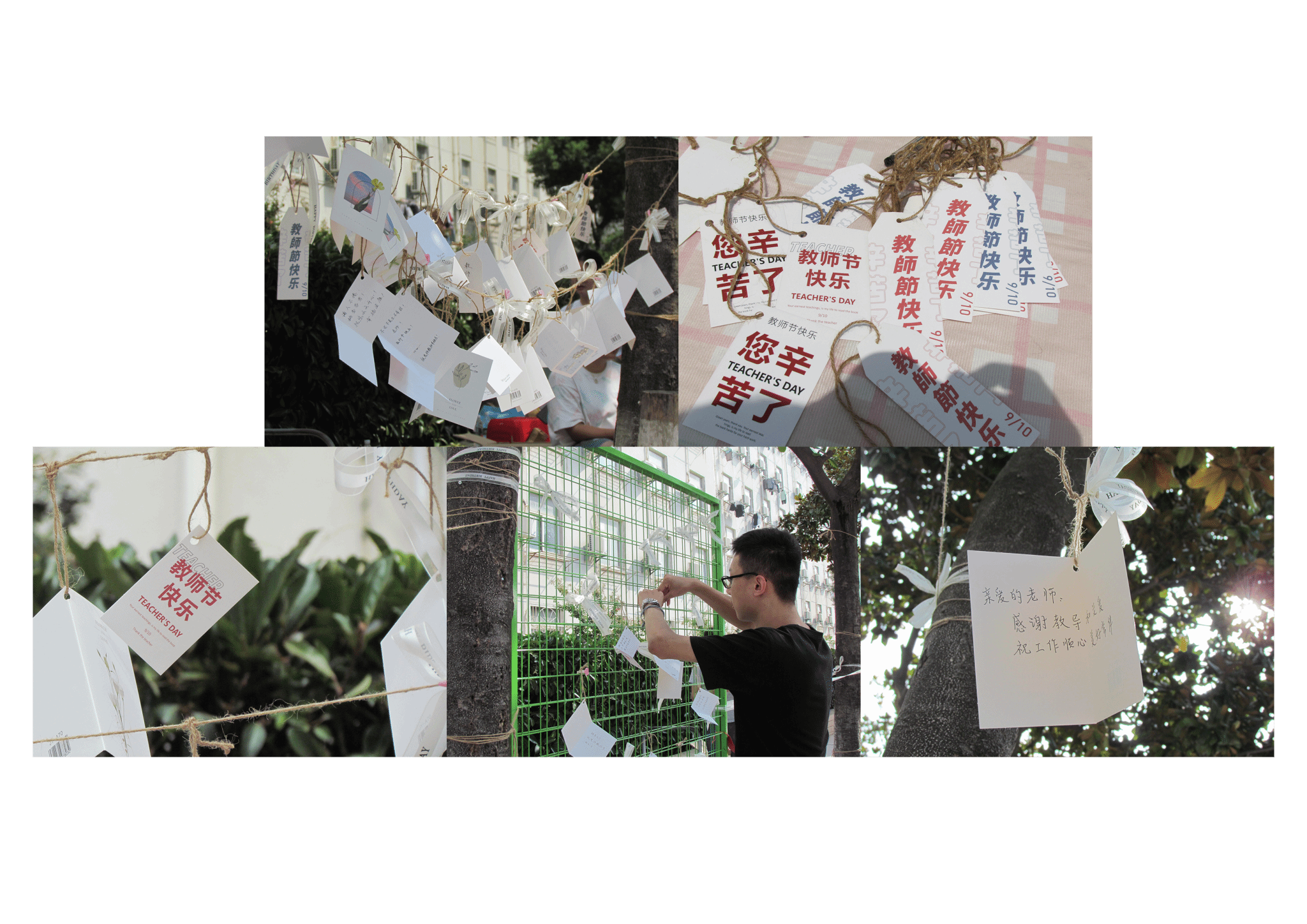 随后展开手绘贺卡送祝福活动。志愿者在树下设立自制贺卡展示区,供学生们展示亲手书写的祝福卡,感念师恩。老师们也在展板上签名,给教师节活动画下了完美的句号,营造了温馨愉悦的校园氛围,拉近了老师与同学们之间的距离。