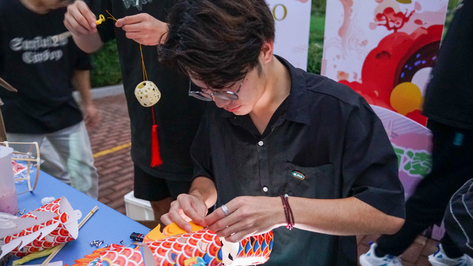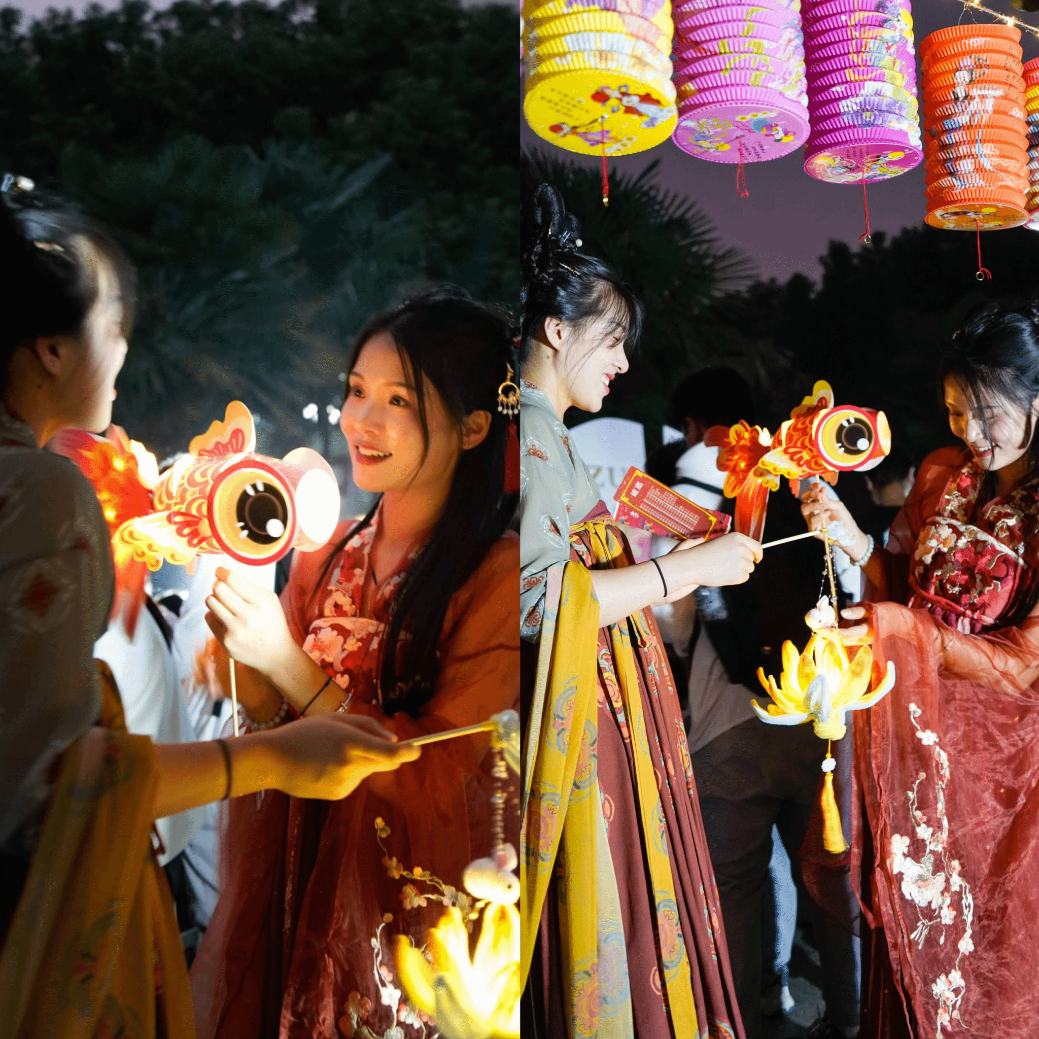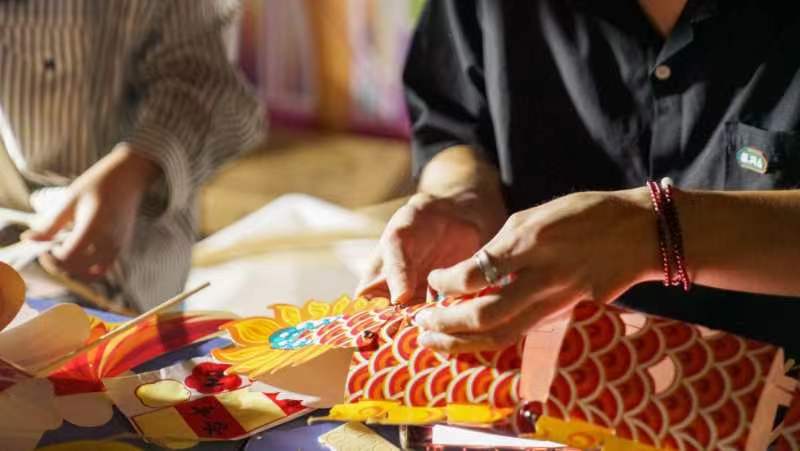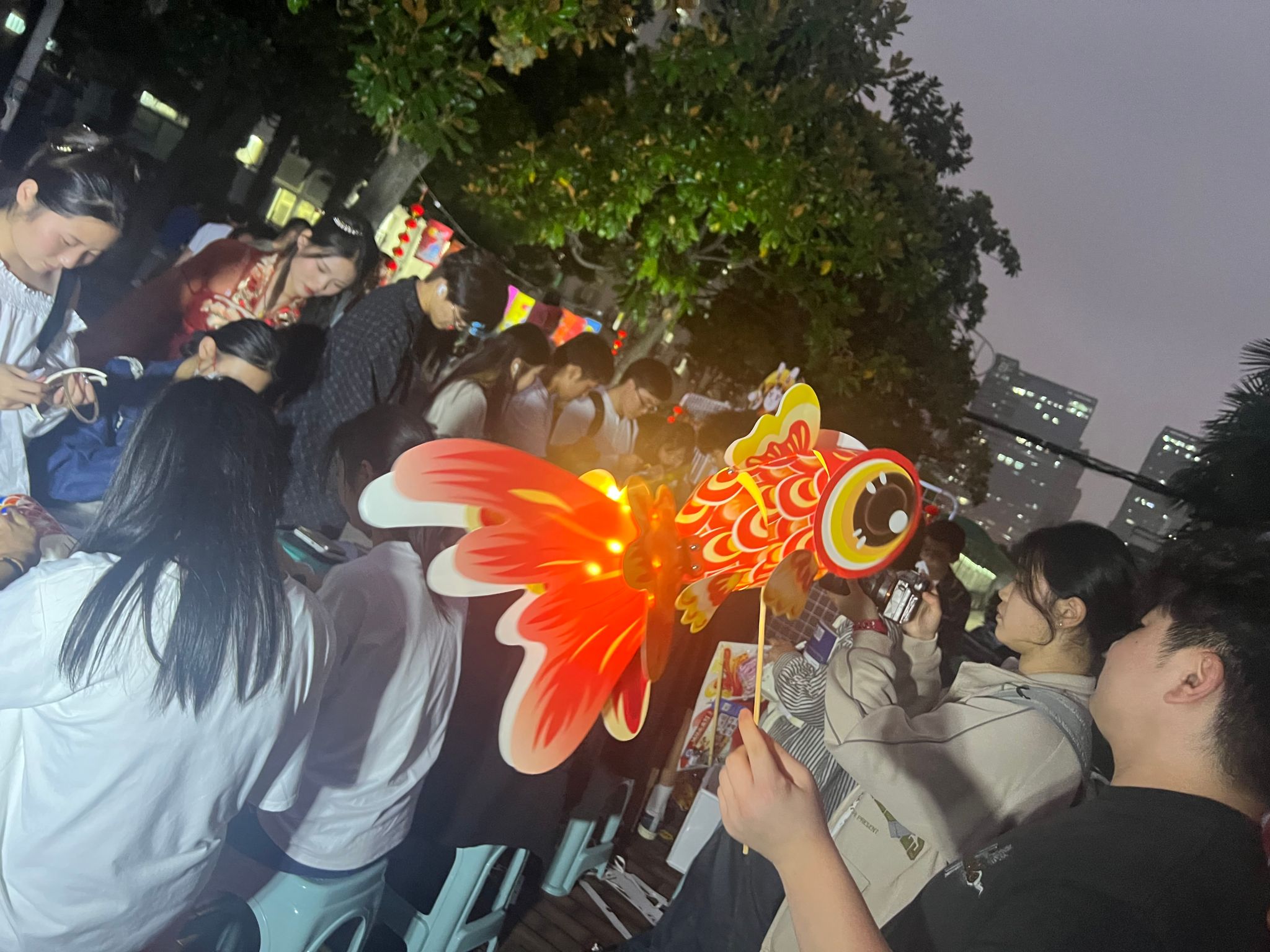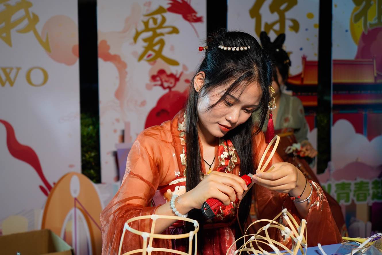 活动中,同学们在身着汉服的学生会志愿者指导下,一起猜灯谜游校园,亲手制作非遗鱼灯、龙灯,在灯影绰约中感受传统文化的魅力,体验古人的中秋梦幻之旅。