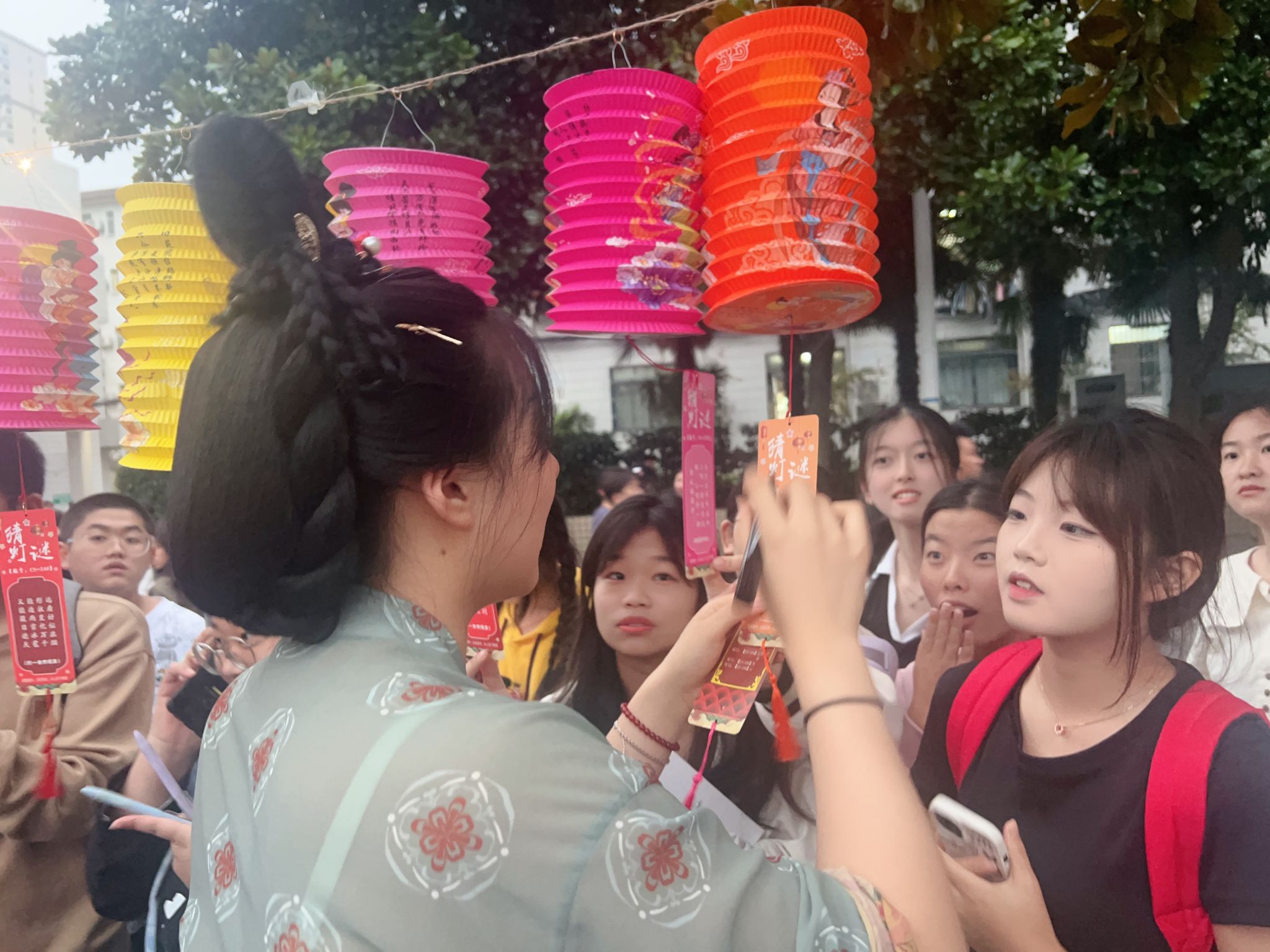 为增加活动的趣味性,活动现场还设置了彩蛋环节,同学们只要身穿汉服,即可前来领取一盏“隐藏版”的荷花提灯,吸引了汉服爱好者的参与。