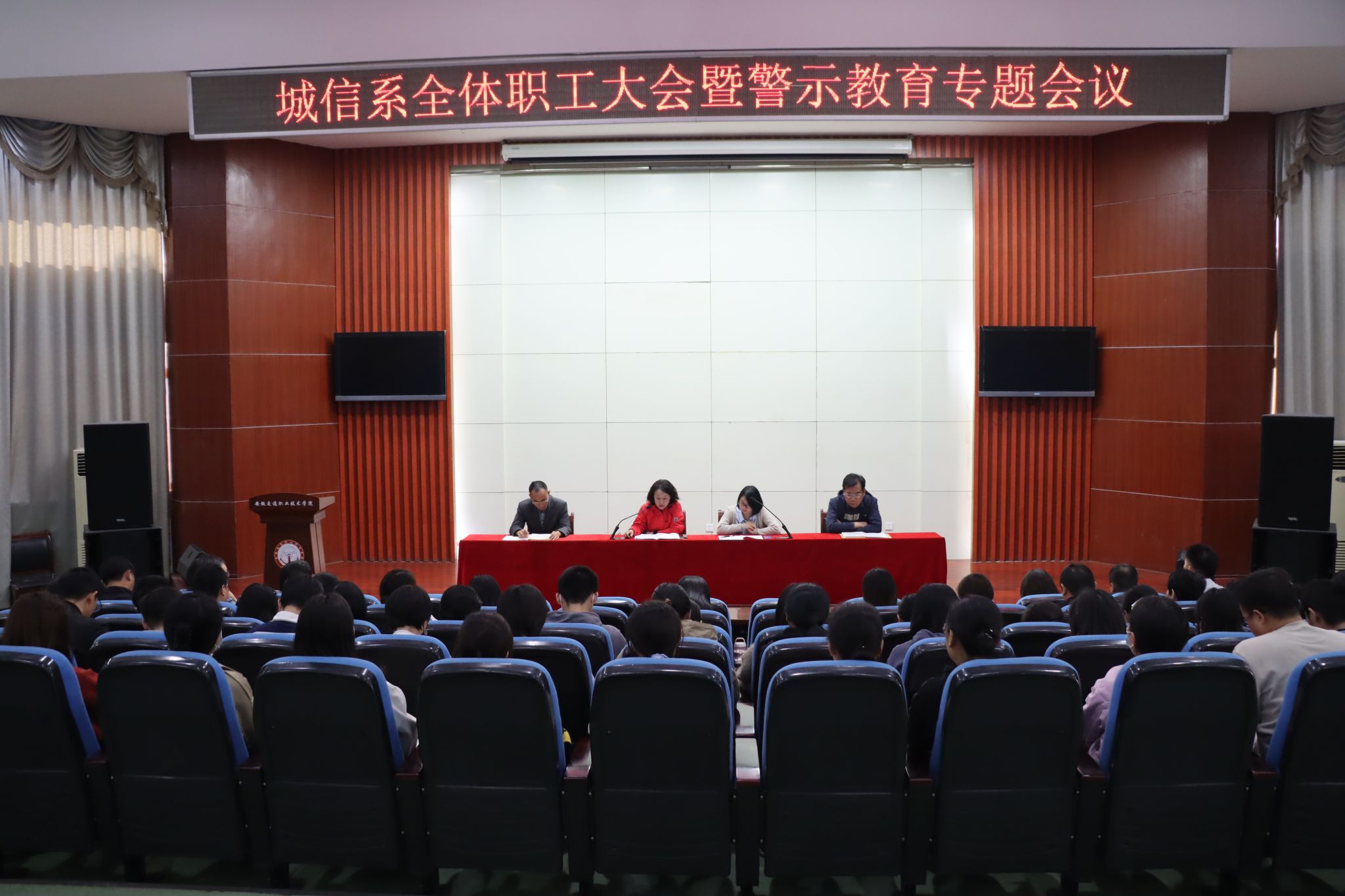 10月20日下午,城信系在学院八角楼召开全体教职工大会暨警示教育专题会议。系领导班子和全体教职工参会,会议由系党总支书记汪倩主持。