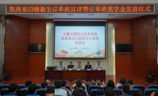 为全面落实党中央、国务院及省委省政府关于高校毕业生就业的决策部署,进一步推动校企合作模式落在实处,11月3日,航海系举行2023级新生订单班宣讲暨订单班奖学金发放仪式,大连国合海事技术服务有限公司指导船长迟振宝、上海首航船务有限公司轮机长张保安、上海中船海员管理有限公司船员调度主管高江皓,航海系领导班子、学生管理老师、辅导员、全体订单班学生及全体2023级新生参加了仪式。