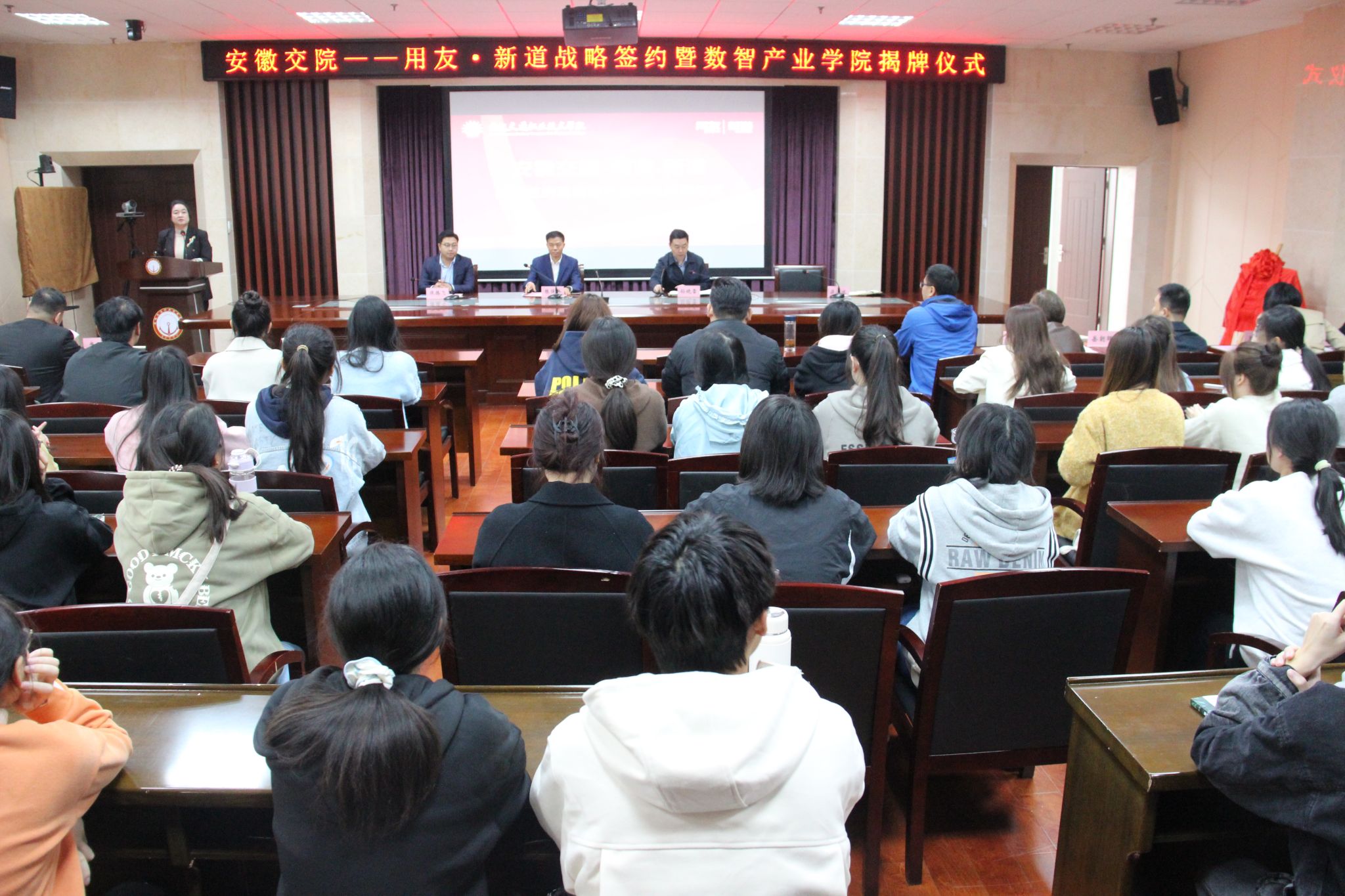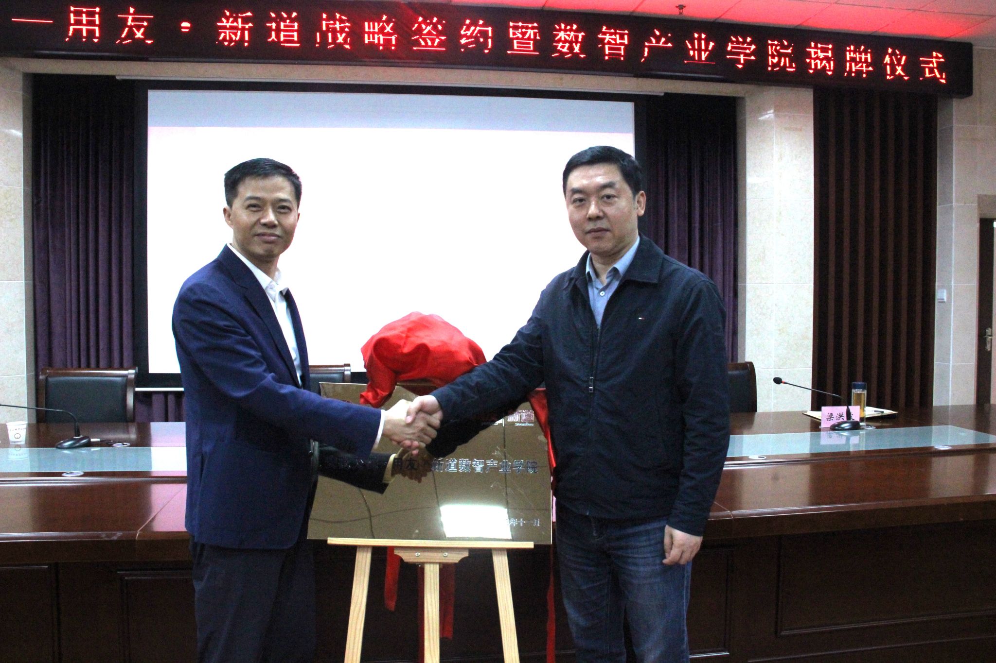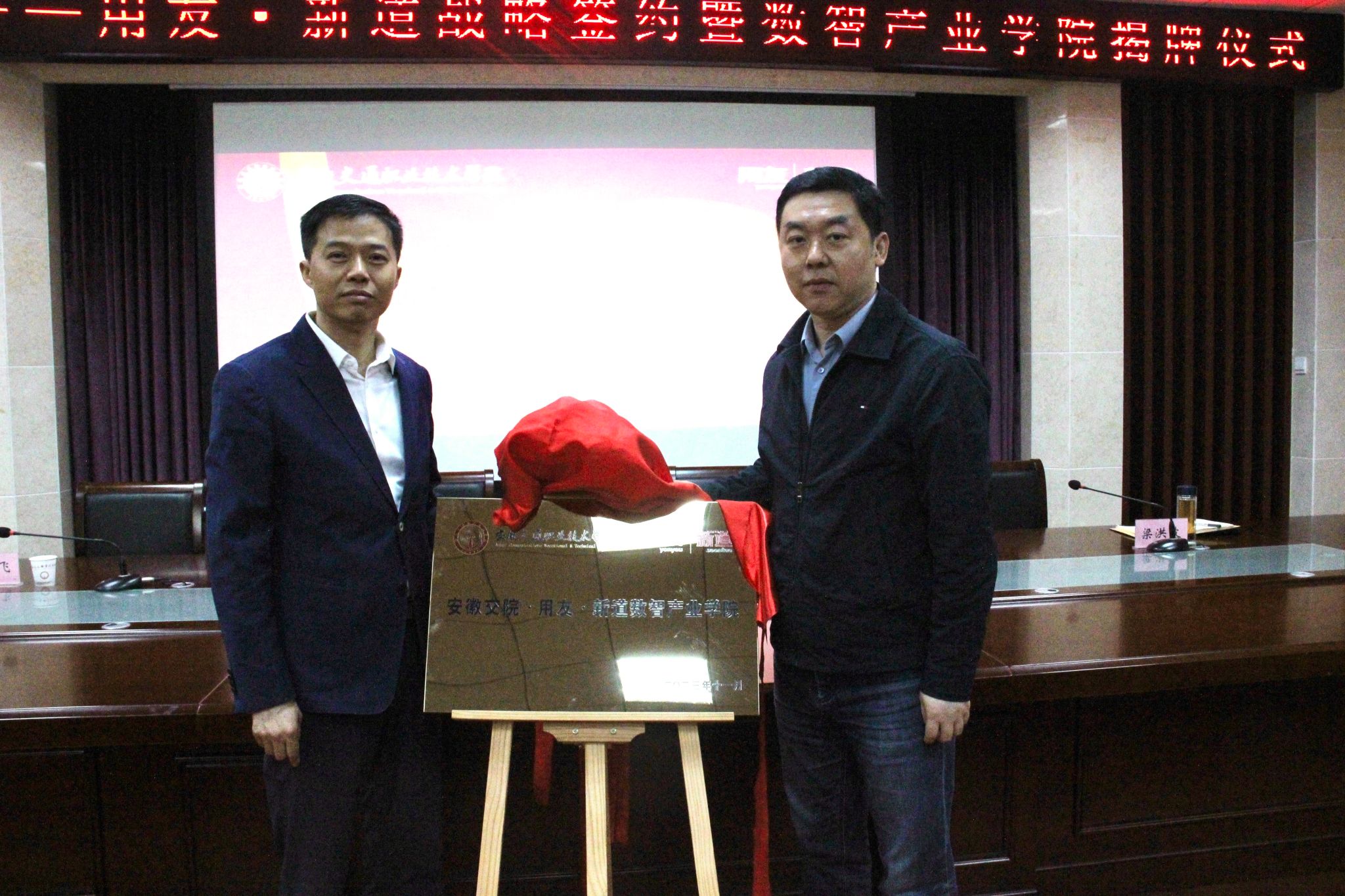 随后,孙晓雷与陈强兵共同签署《安徽交职院-用友·新道数智产业学院战略合作协议》,并共同为数智产业学院揭牌。