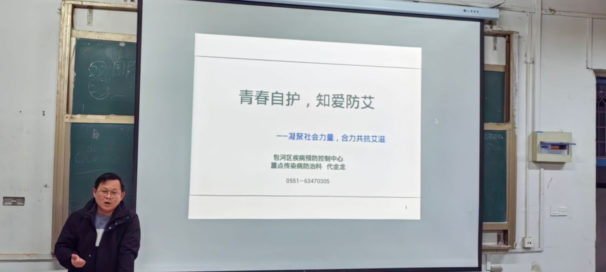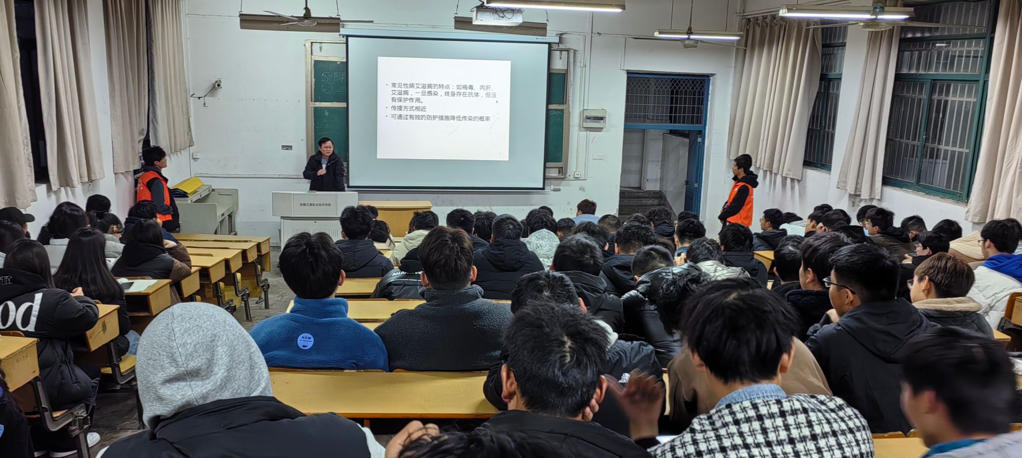 11月30日,为发挥学校、学生社团开展艾滋病防治宣传教育重要阵地的作用,根据“世界艾滋病日”宣教要求及“服务育人”教育宗旨,包河区疾病预防控制中心重点传染病防治科代金龙主任应邀在学院南区对在校生开展了一场以“青春自护,知爱防艾”为主题的宣教活动。现场200余名各系学生代表参加了此次宣教活动。活动通过疾病科普、疾病预防、健康守护等三方面科普了预防艾滋病工作的重要知识。此外,代金龙主任还对现场学生的提问给予了专业解答。