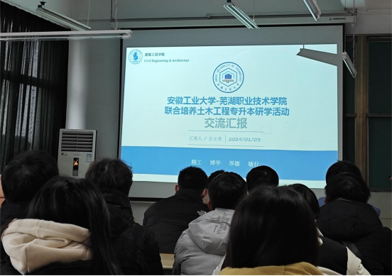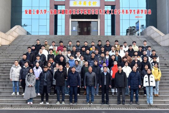 为深化与安徽工业大学的合作,进一步提升联合培养土木工程专升本学生的教育教学质量,1月3日,土木工程系主任王东、道路桥梁工程教研室主任王雷、本科教育教学管理办公室主任孙鹏轩及相关教师带领2023级联合培养专升本78名学生赴安徽工业大学建筑工程学院开展研学交流活动。建筑工程学院党委书记张虎、副院长吕忠、王颖之、方圆及骨干教师高度重视,认真筹备,策划了一系列内容丰富、形式多样的交流活动。从学术报告、专业课教学,到团学活动与竞赛经验分享,再到党课报告会与专业实验室参观,每一项活动都旨在为学生们提供一个深入学习与交流的平台。