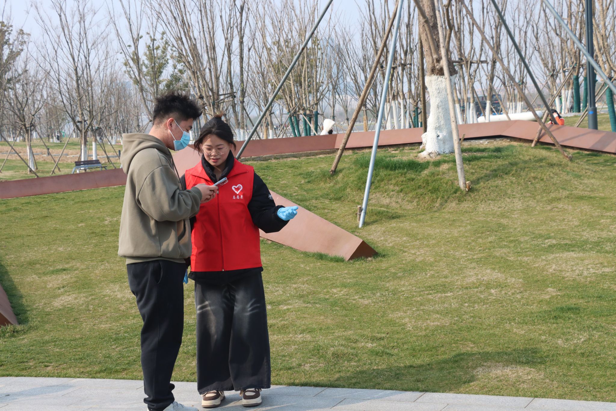 志愿者们秉承着“自我实践、服务他人、自我教育、推动社会”的志愿服务宗旨,在骆岗中央公园中默默奉献,热情服务游客。青年志愿者们团结协作,认真负责,主动拾起草坪上的垃圾,积极为游客们指引方向,答疑解惑。以自身服务为行动,在园内共筑爱心桥梁。