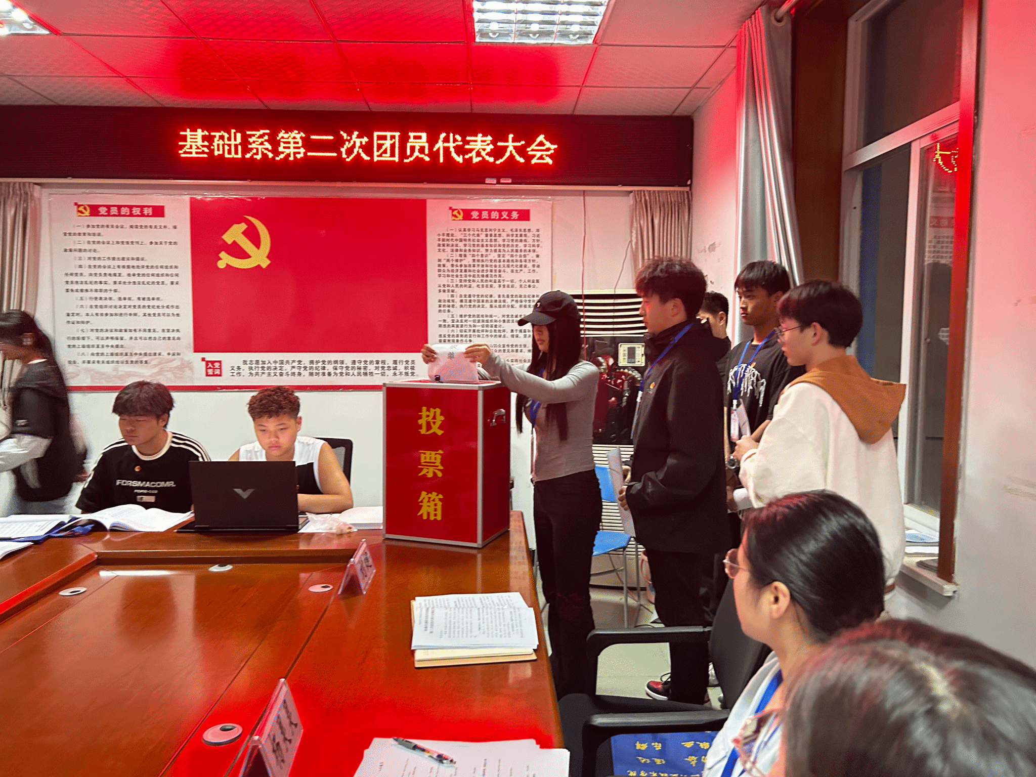正式会议上,团代表们听取并表决通过了基础系第一届团总支部委员会工作报告《青春建功心向党 踔厉奋发向未来》,通过无记名投票方式,实行差额选举,最终选出了新一届团总支部委员会。最后,在激昂嘹亮的团歌声中,基础系第二次团员代表大会胜利闭幕。