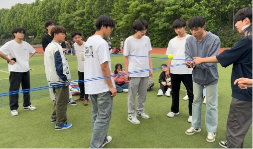本次活动在春日暖阳下拉开序幕。在经过热身小游戏后,又开展了“一圈到底”“轨道传球”“珠行万里”等一系列生动又有趣的活动。在各项目负责人的带领下,每一位同学都热情参与、团结协作、克服困难、挥洒汗水,操场上回荡着欢声笑语,现场气氛达到高潮。