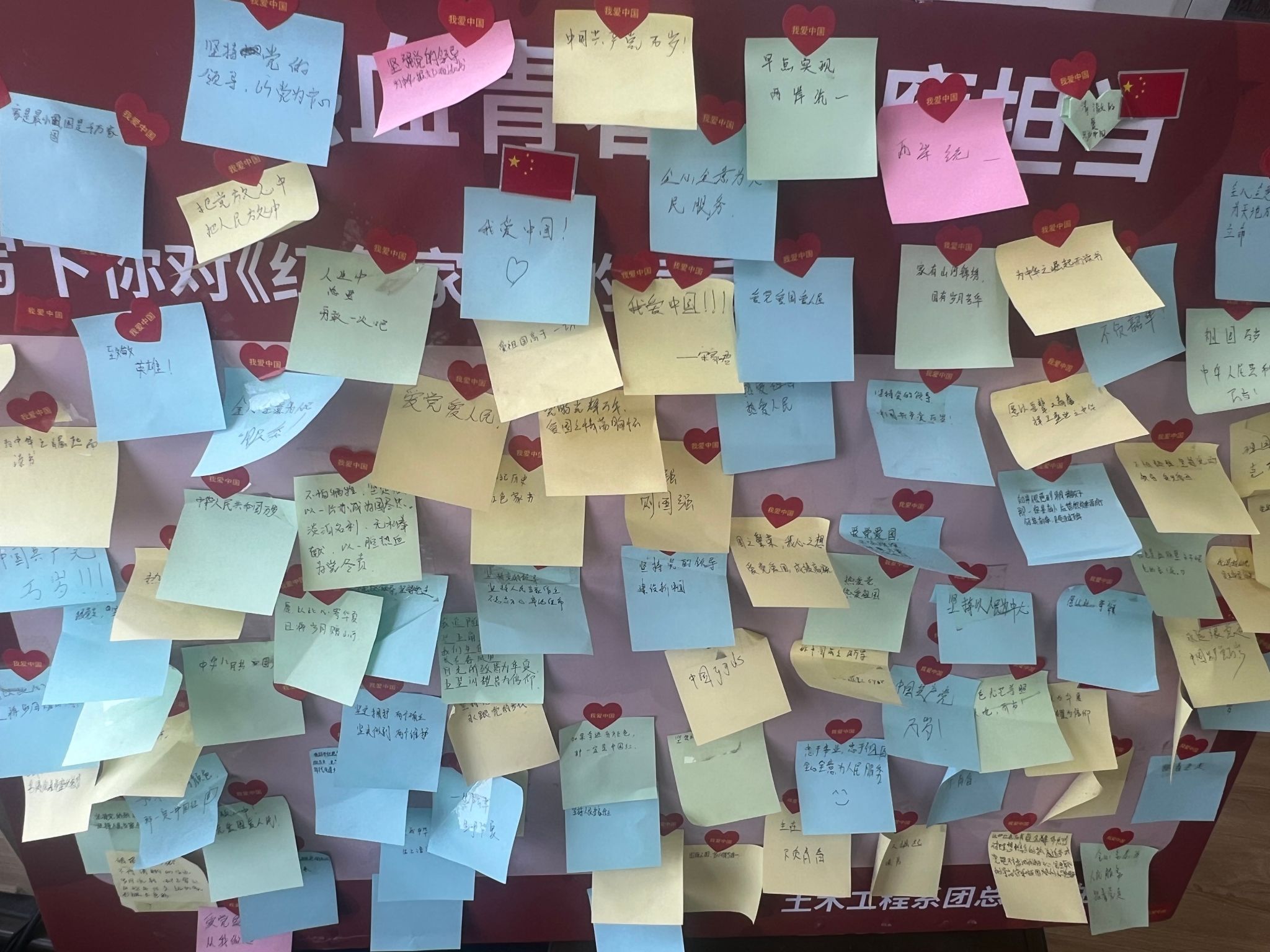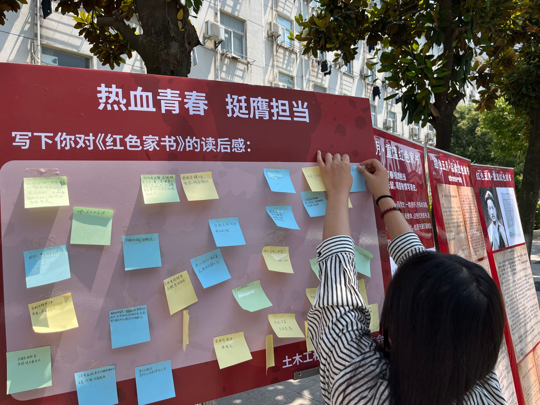 在活动中,同学们纷纷在展牌前驻足,认真阅读着这些饱含深情的红色家书,写下自己的感言贴在展板上。一字一句间充满着对革命先烈的尊敬,对那段烽火岁月的感悟。