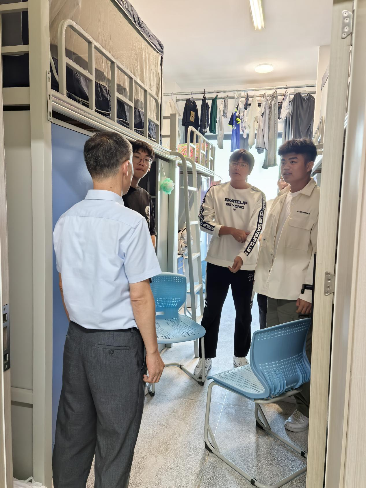 9月23日,院党委委员、纪委书记季传友,管理系党总支书记汪思曼以及新生辅导员来到宿舍,他们鼓励新生珍惜大学时光,努力学习,注重综合素质提升,并强调宿舍是生活、学习与交流的重要场所,要注意宿舍安全,遵守学校规章制度,共同营造一个安全、舒适、和谐的生活环境。新生们对老师们的关怀表示衷心感谢,纷纷表示会积极适应新环境,努力学习,不负韶华,为未来的大学生活奠定坚实基础。