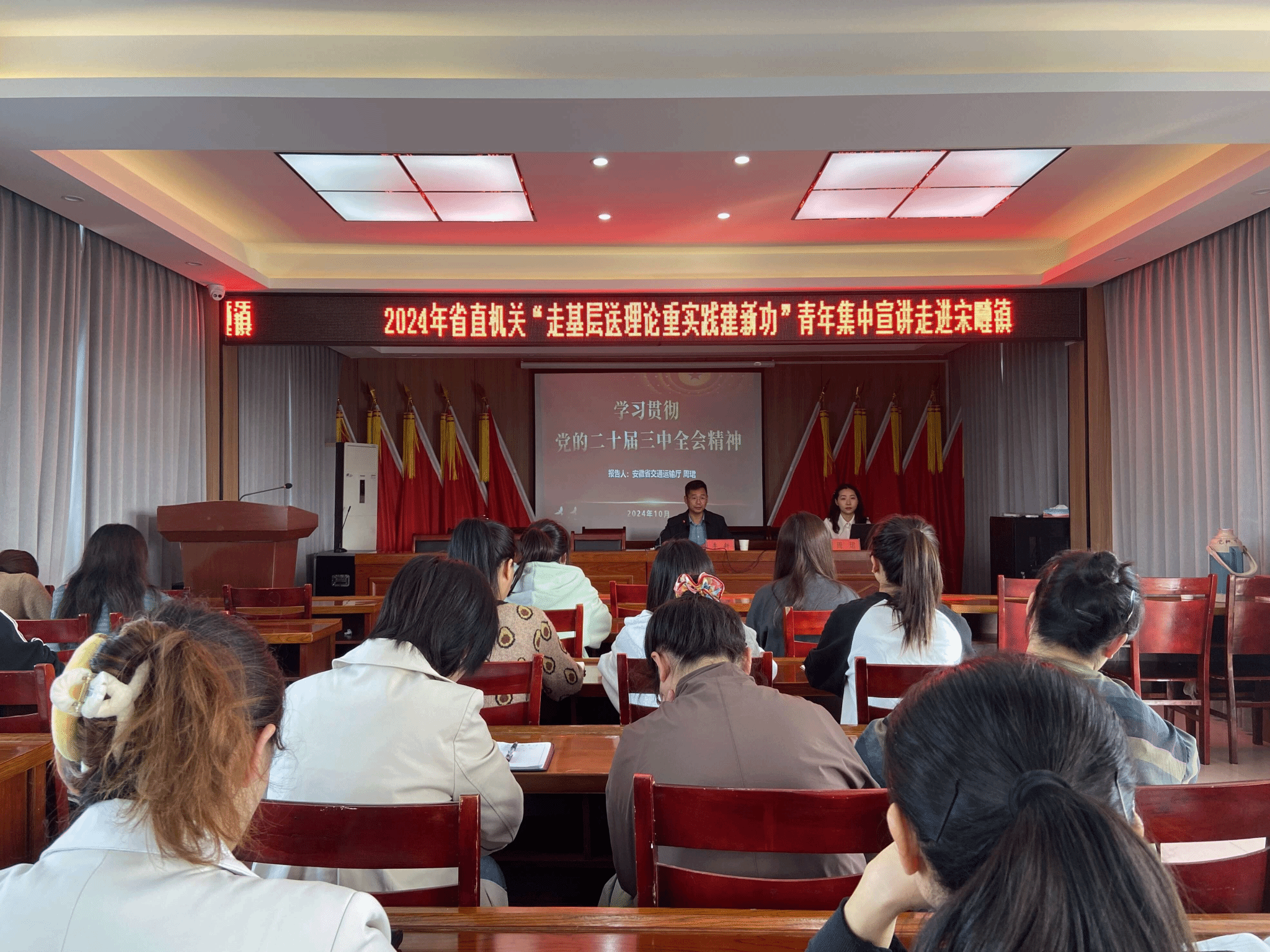 为深入学习贯彻党的二十届三中全会精神,充分发挥省直机关青年理论宣讲骨干作用,省直机关工委于近日开展省直机关“走基层 送理论 重实践 建新功”青年集中宣讲调研活动。学院青年教师周珺作为省交通运输厅青年理论宣讲组成员赴于10月9日赴淮北市烈山区宋疃镇开展集中理论宣讲。