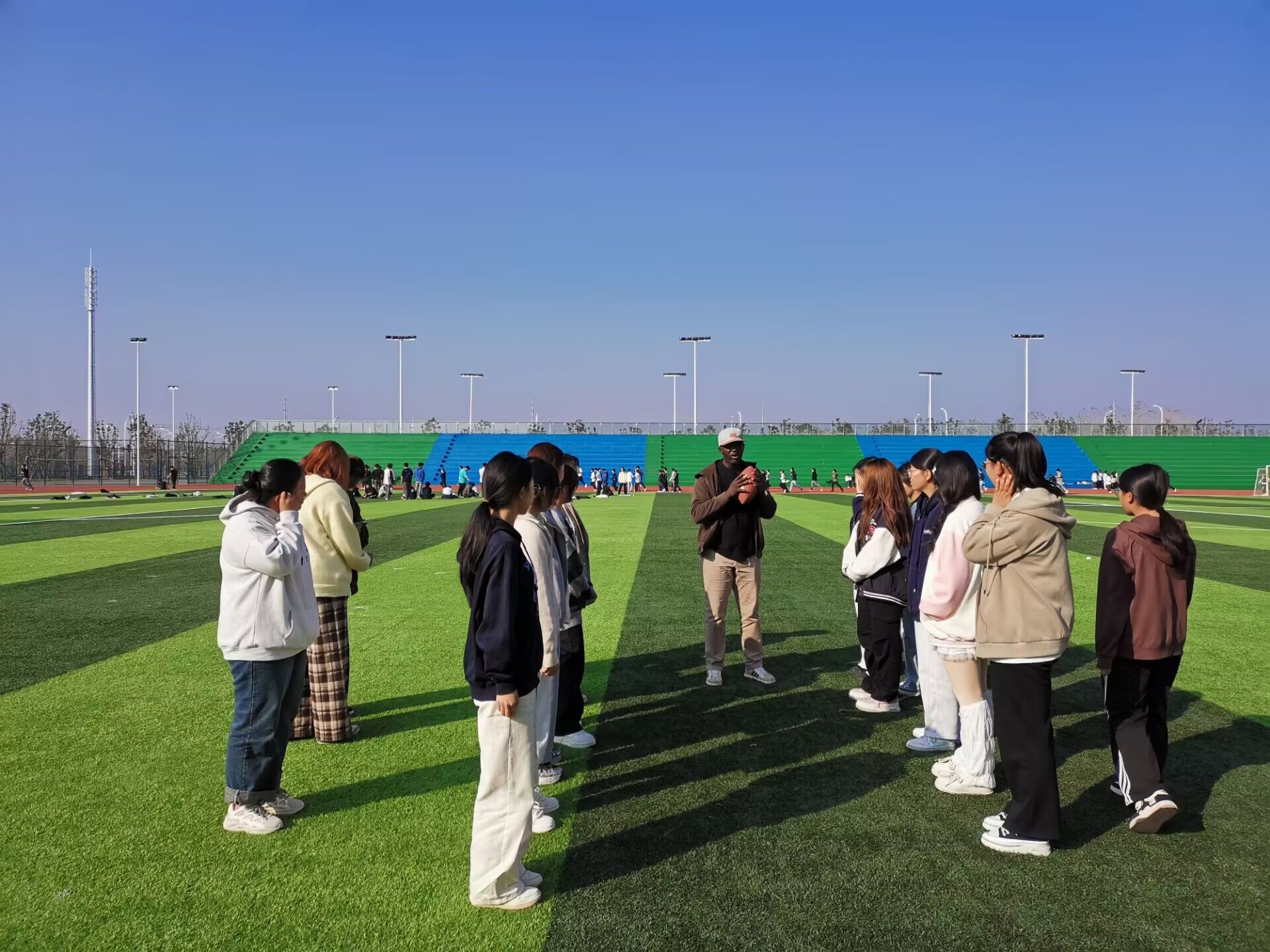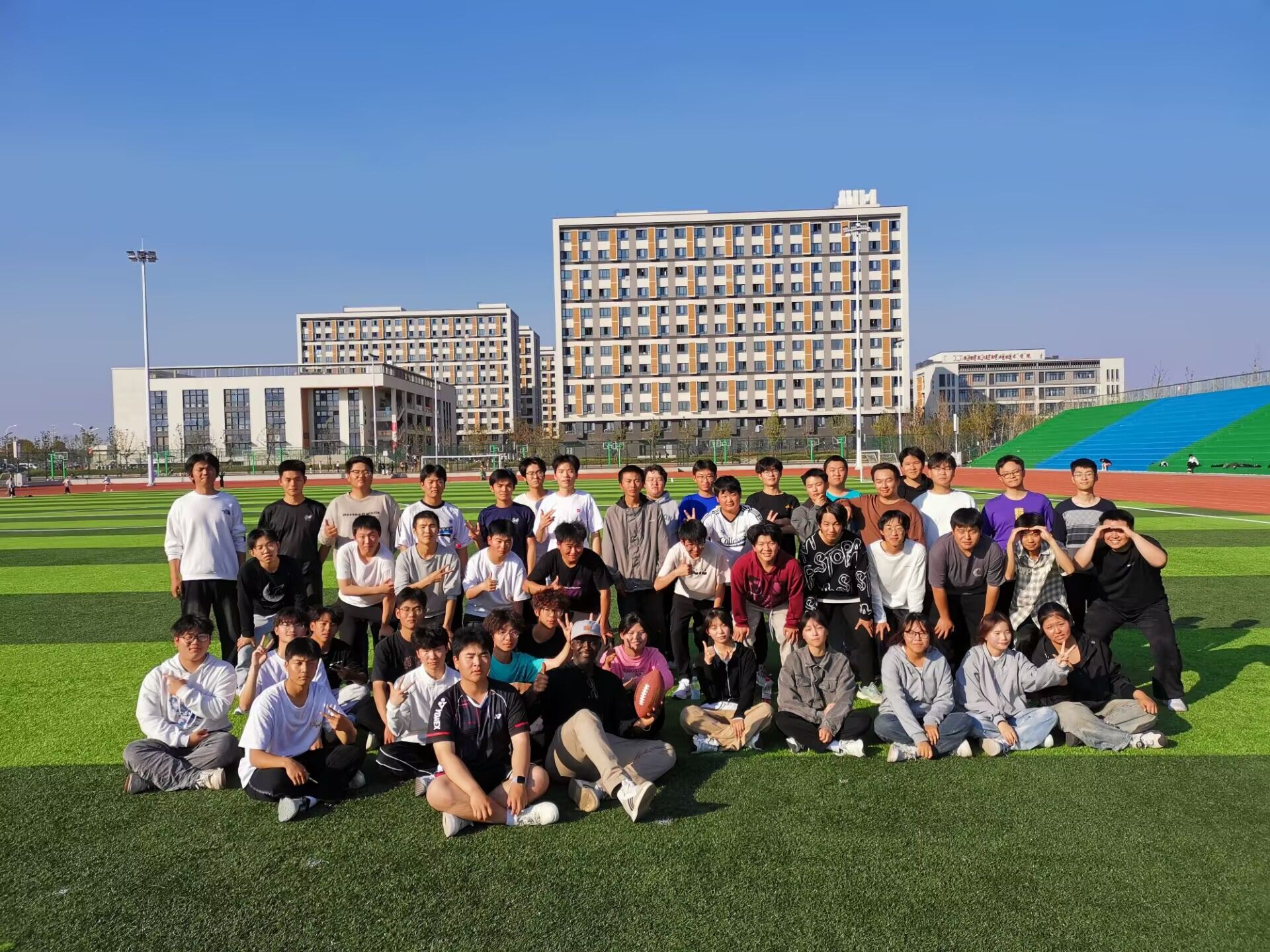 本次活动由城信系2024级计算机应用(中外合作专业)3班和4班的英语外教Mohamadou Djida Ismaël携手国际班辅导员张伟涵精心策划,中外合作班级全体学生参加。活动现场,同学在外教老师Mohamadou Djida Ismaël的指导下,将英语学习与橄榄球运动巧妙结合,体验了精彩的户外课堂。