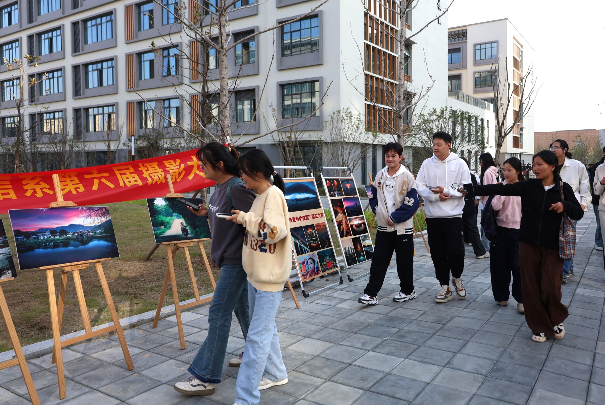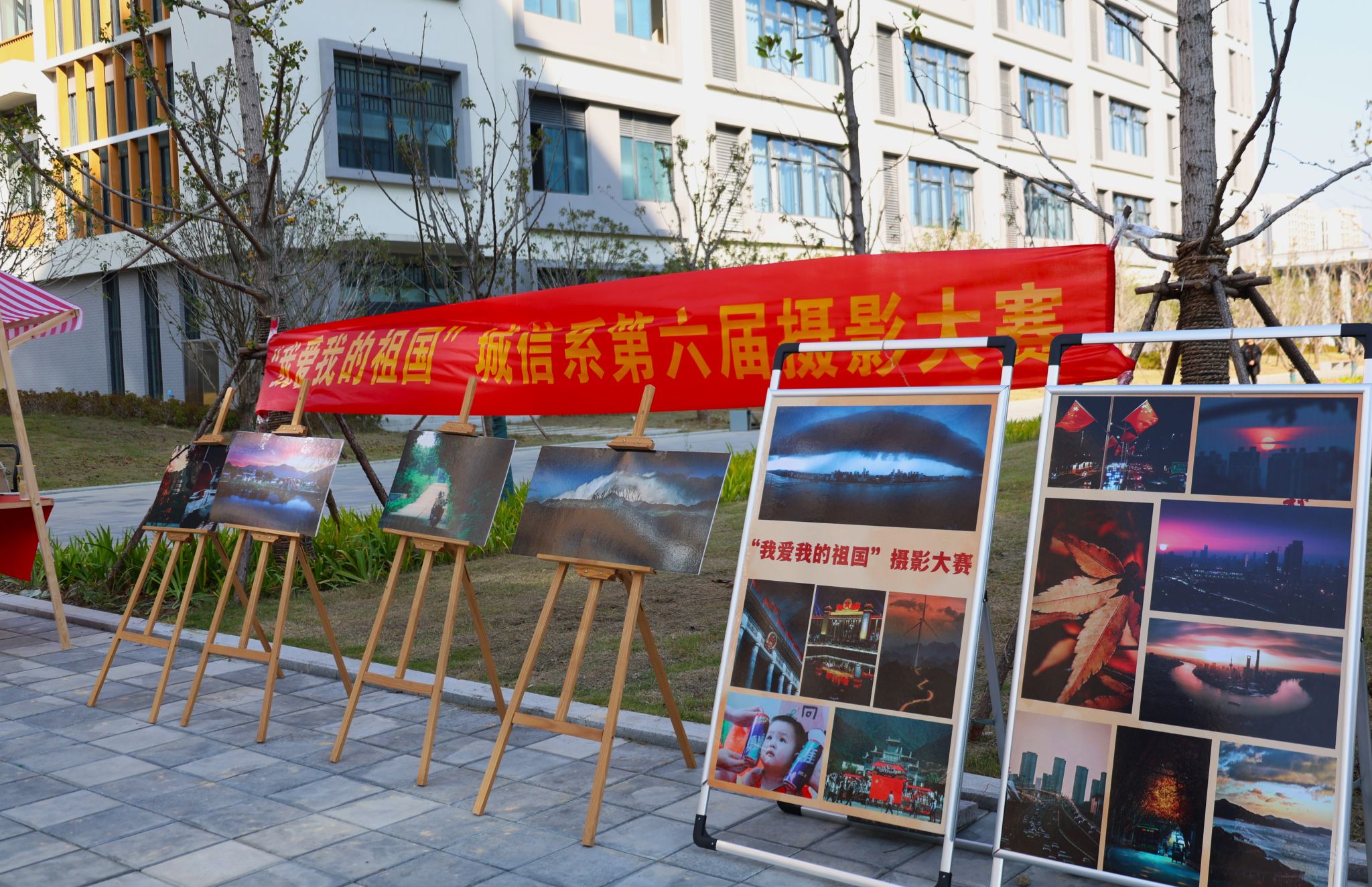 本次比赛受到全系摄影爱好者的广泛关注和积极参与,共征得百余组摄影作品,最终评选出19位同学的优秀作品。于11月11日在尚能楼与崇德楼间进行展出。展出的作品记录着青年的意气风发,定格下祖国的盛世华章。