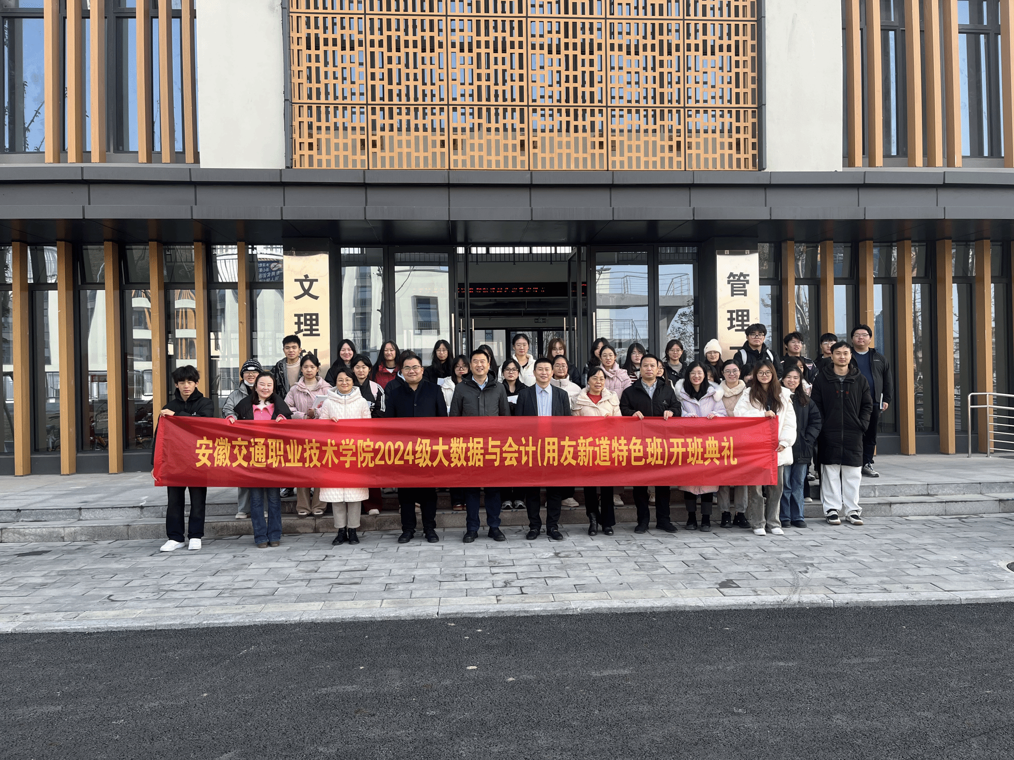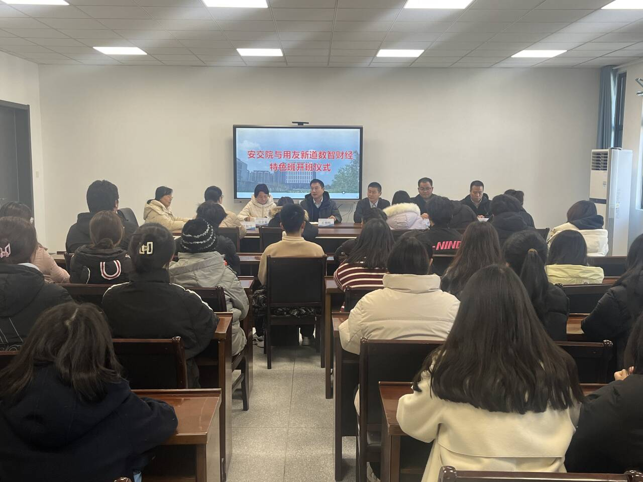 12月12日,学院与用友新道在文华楼隆重举行数智财经特色班开班仪式。管理系主任岳朝晖、副主任吴金菊、会计教研室主任韩素兰与部分教师代表,用友新道股份有限公司安徽分公司总经理王小明、高级教育咨询顾问黄锐、教育规划顾问董力贤和校企合作经理张安以及24会计1班全体学生等参加仪式。