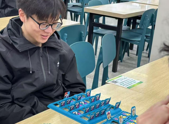 桌游区同样热闹非凡,大家围坐在桌旁,沉浸在益智游戏的世界里。同学们需要诱导对方做出他们头顶上写的动作,选手们或眉头紧锁,或气定神闲,演技和套路齐飞,战略和智慧在博弈中展现的淋漓尽致。这种集推测和提问于一体的游戏,让每一局都充满了变数和惊喜。