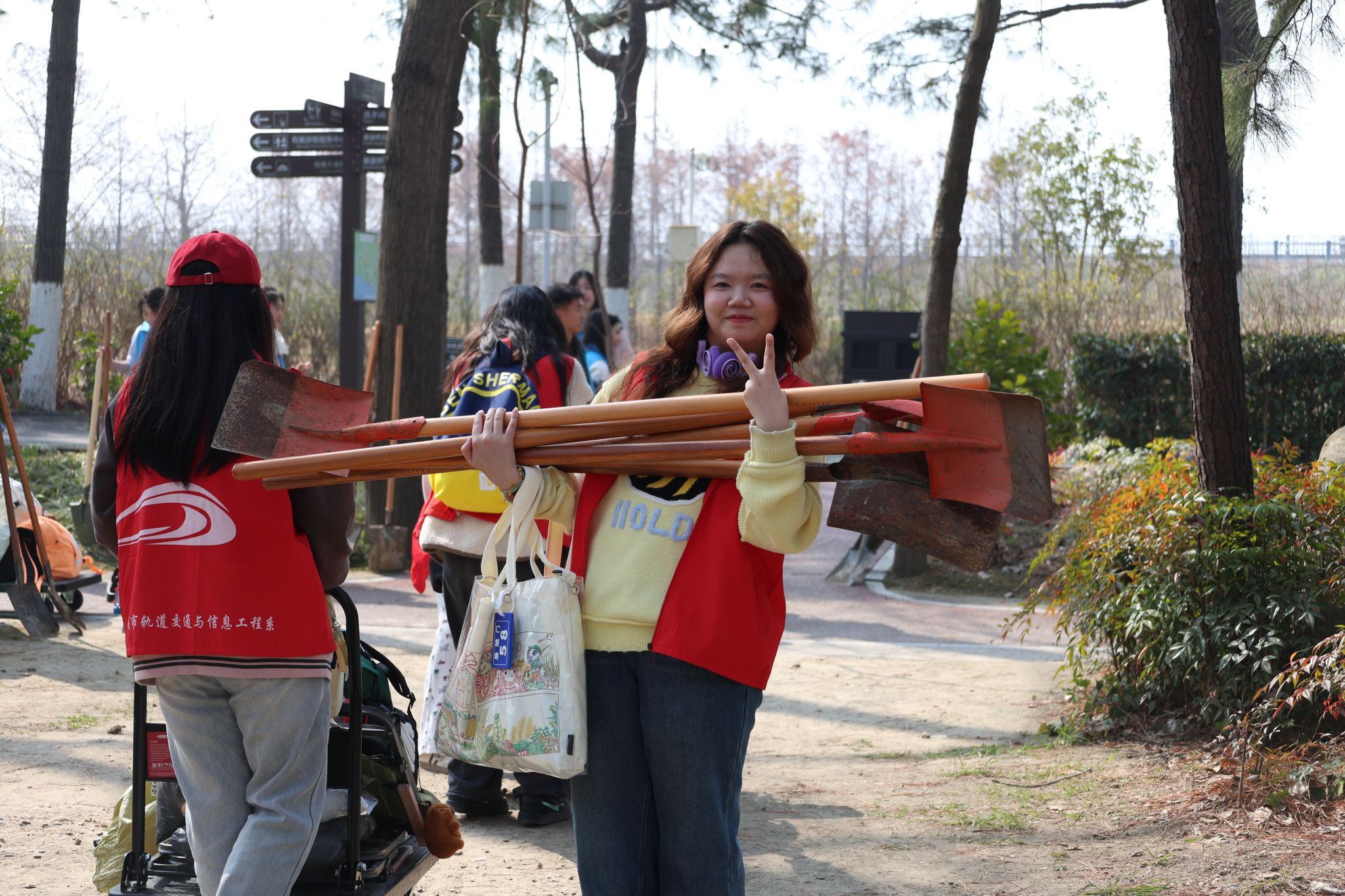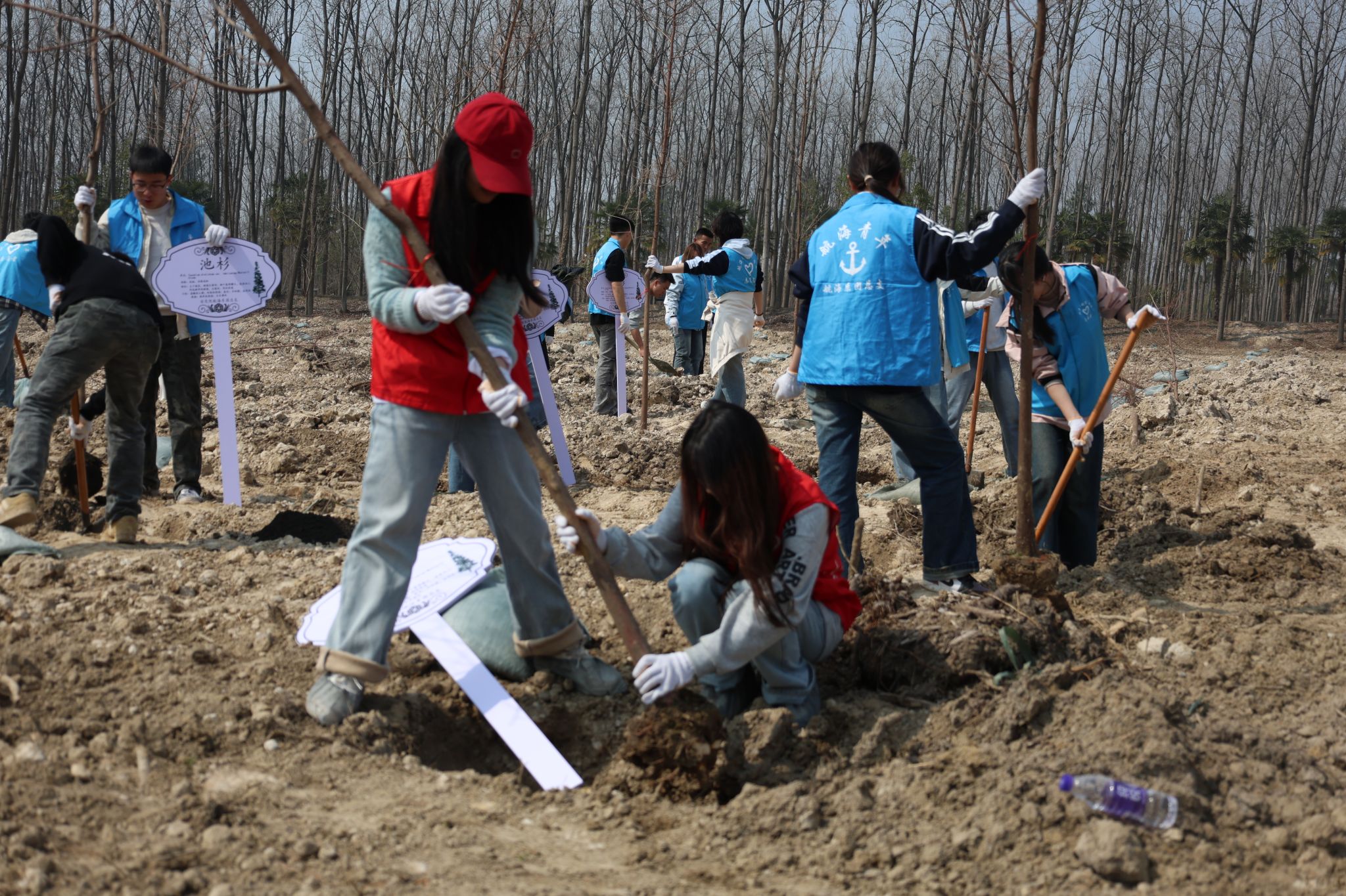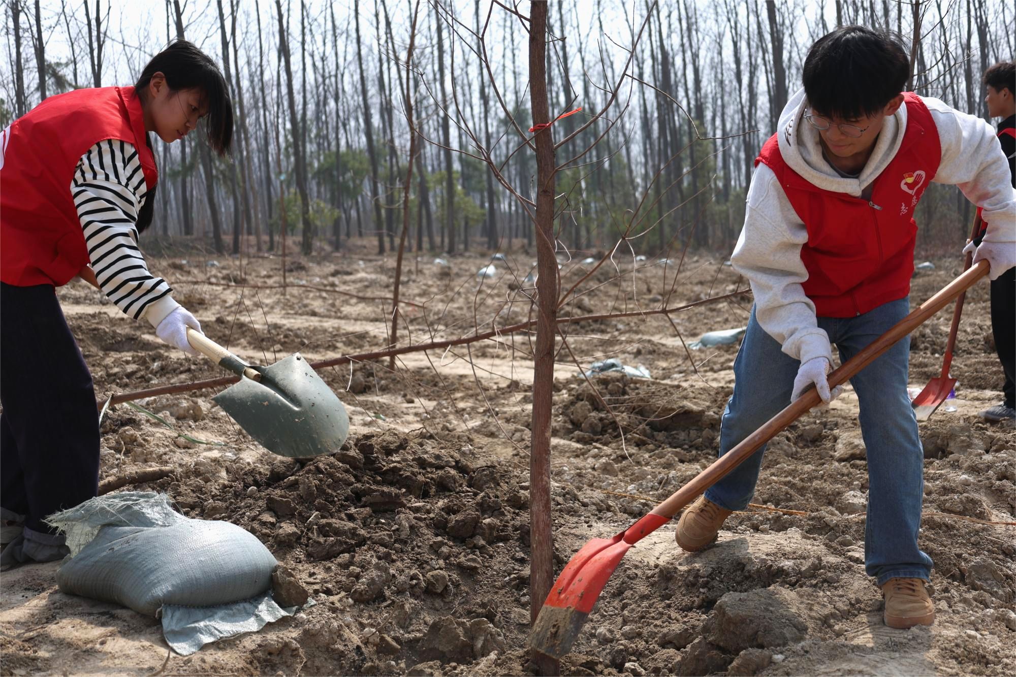 活动当天,阳光明媚,春风拂面。在老师的带领下,学生党员和志愿者们早早来到植树地点,大家热情高涨,干劲十足。活动现场,同学们分工明确,有的挥锹挖坑,有的扶正树苗,有的培土浇水,各个环节井然有序,配合默契。经过一上午的辛勤劳动,一棵棵池杉树苗整齐地挺立在春风中,为大地增添了一抹新绿。