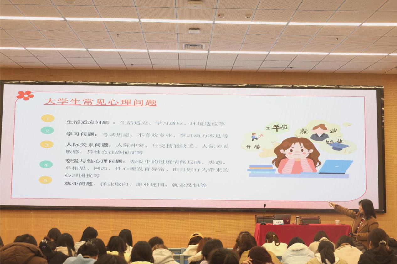 随后,刘金凤老师结合女大学生在学习、生活和情感方面可能遇到的心理健康问题,深入浅出地讲解了心理健康的重要性、常见心理问题的识别与应对、情绪管理与压力缓解技巧等内容。同时,她还分享了与同学们建立积极人际关系、面对困难时寻求帮助的方法,鼓励同学们在面对心理困扰时勇敢寻求专业帮助。