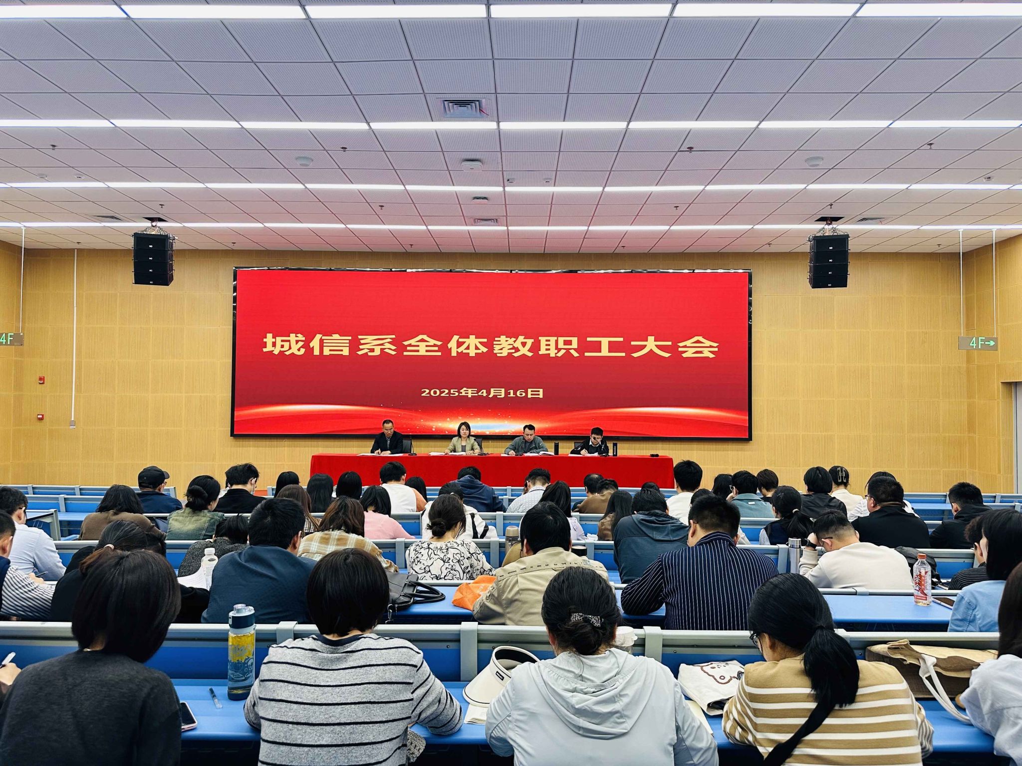 4月16日下午,城信系在图书馆四楼报告厅召开全体教职工大会,会议由系党总支副书记、副主任张峰主持,系领导班子和全体教职工参会。