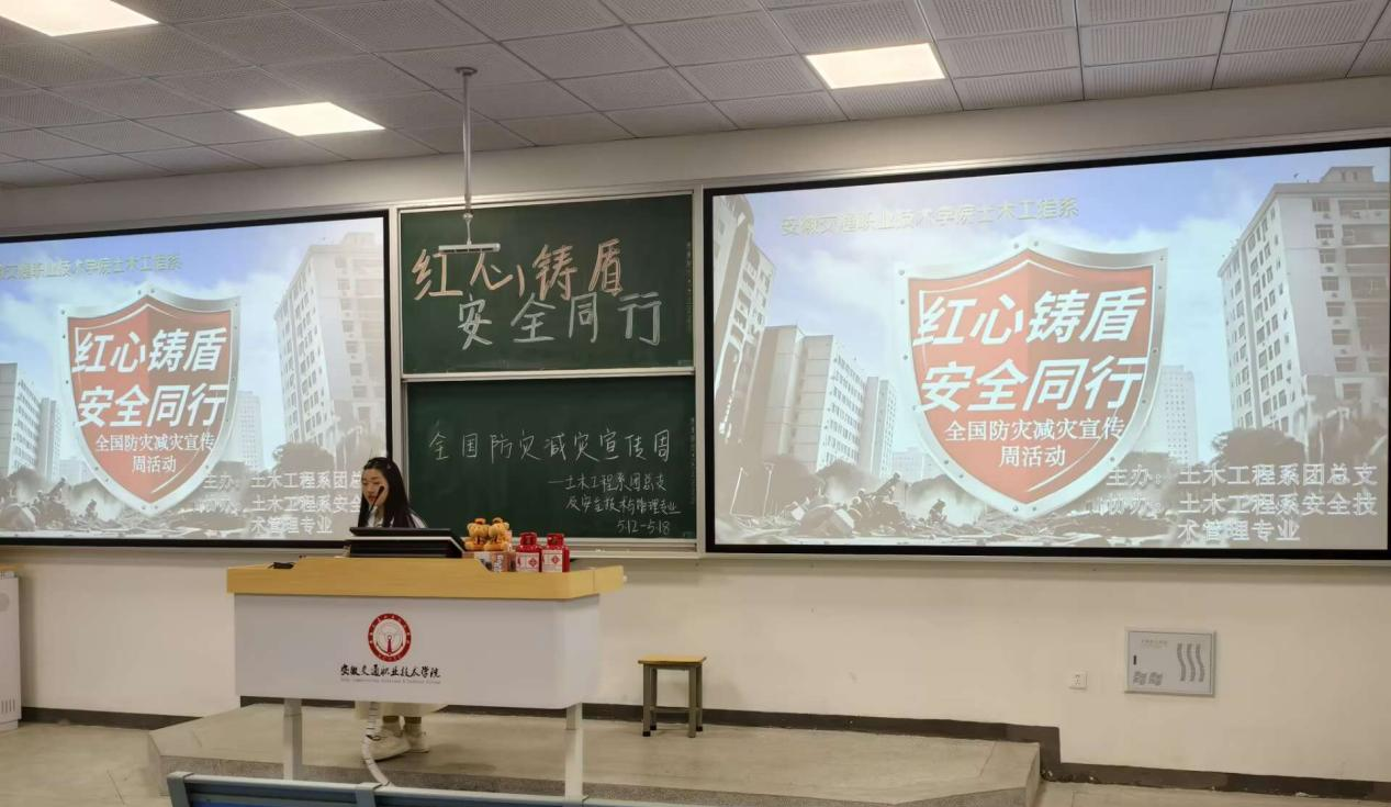 为深入贯彻落实习近平总书记关于防灾减灾救灾的重要论述,积极响应党中央、国务院关于防灾减灾工作的决策部署,5月14日,土木系团总支与造价与安全教研室以全国防灾减灾宣传周为契机,围绕“红心铸盾 安全同行”主题,联合开展系列宣传教育活动,将安全理念融入校园实践,筑牢校园安全防线。土木系副主任王佳宾、安全专业教师史晴晴出席本次活动,23、24级学生代表参加活动。