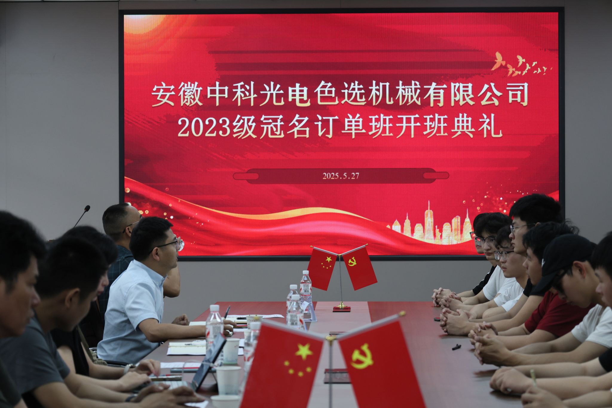 为进一步深化产教融合,持续拓展校企合作深度和广度,积极创新高素质技能型人才培养模式,5月27日下午,城信系与安徽中科光电色选机械有限公司联合举办的2023级订单班开班典礼在学院新桥校区敏行楼A316会议室隆重举行。安徽中科光电色选机械有限公司行政副总经理段贤军、人力资源部部长陈凤、生产部副部长孙世想、售后服务部技术支持工程师涂友龙,城信系党总支书记汪倩、副主任李志成、系党总支副书记承友明、订单班全体学生出席开班仪式。仪式系党总支副书记由承友明主持。