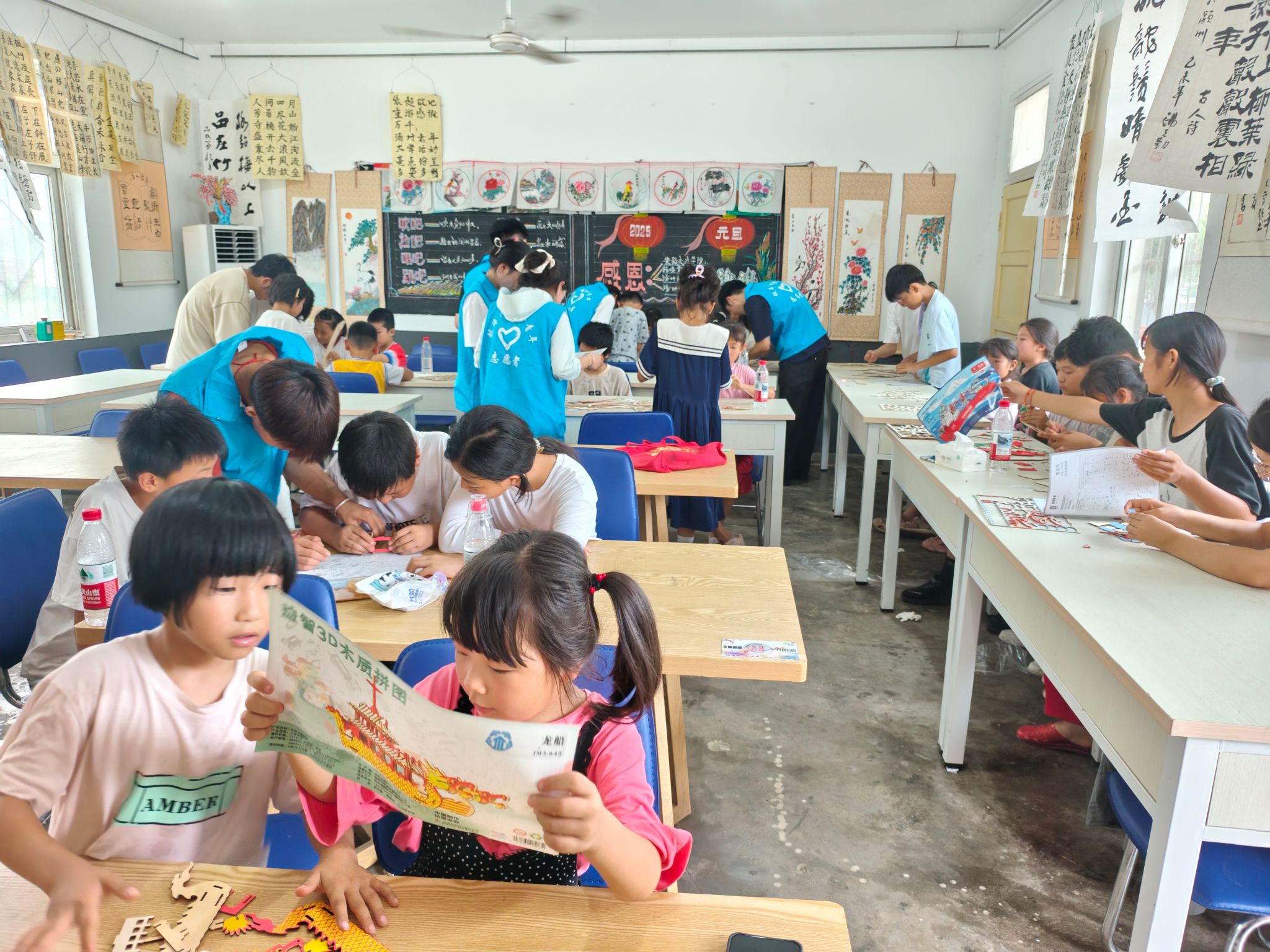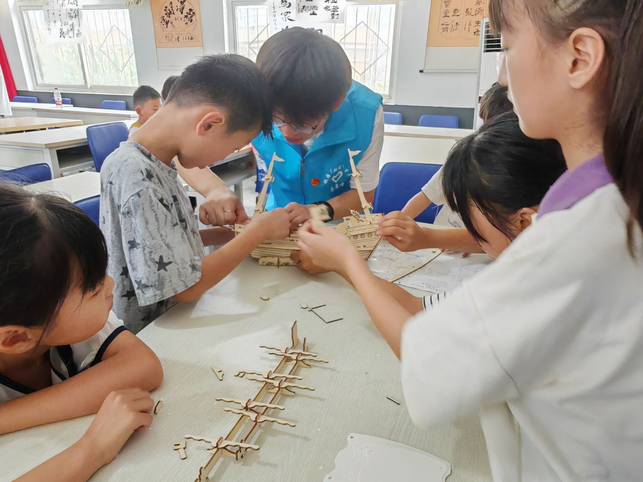 船舶模型制作与游戏体验活动现场气氛热烈,成为当日的“人气焦点”。志愿者带领乡村儿童共同制作南湖红船、雪龙号破冰船、海军驱逐舰等具有象征意义的船舶模型,在拼装、调试的实践过程中,讲解船舶浮力原理与结构力学知识,让小朋友亲身感受科技魅力与工匠精神。模型试航环节中,小小“航海家”们在志愿者指导下操控船只,直观理解航行规律。随同开展的投壶、套圈等趣味游戏融入团队协作理念,孩子们在欢声笑语中增强了集体荣誉感,实现了“寓教于乐”的育人目标。