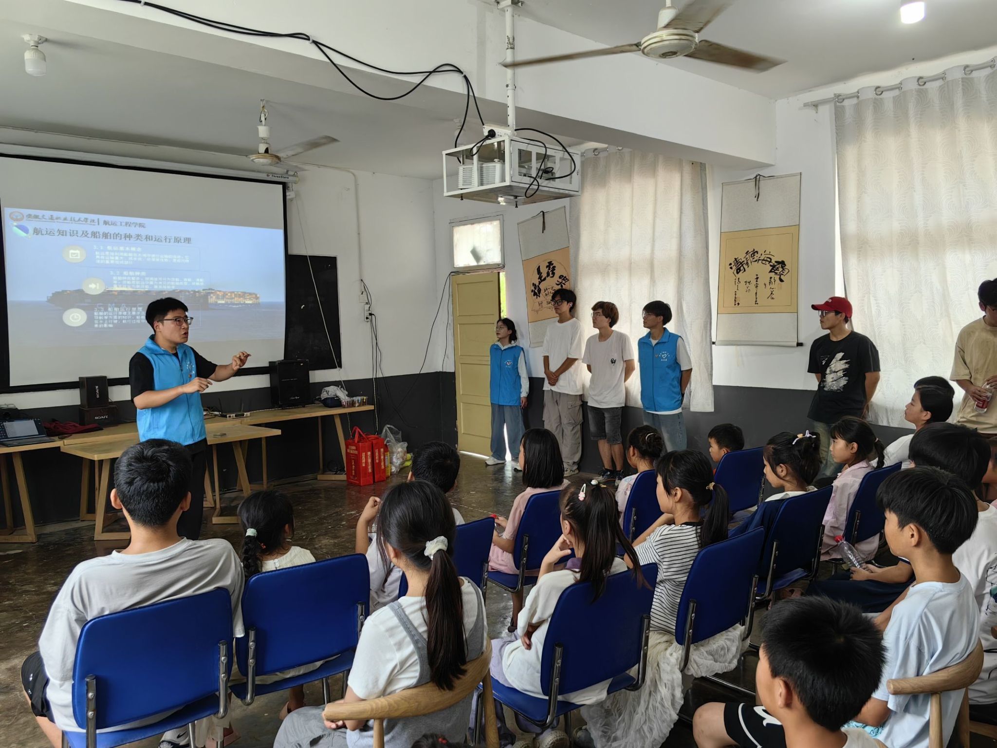 7月16日下午,汤圩村小学的教室内热闹非凡,一场别开生面的航运知识小课堂在此拉开帷幕。学院志愿者充分发挥专业优势,以“航运联通世界,梦想点亮未来”为主线,通过生动有趣的航海故事、直观形象的动画短片,系统讲解船舶分类、构造原理及航行奥秘,深入浅出阐释航运在国民经济发展、民生保障中的重要作用。孩子们眼中闪烁着好奇的光芒,在互动问答中探索蓝色国土的无限可能,一颗颗“航海梦”的种子在乡村沃土中悄然萌发。