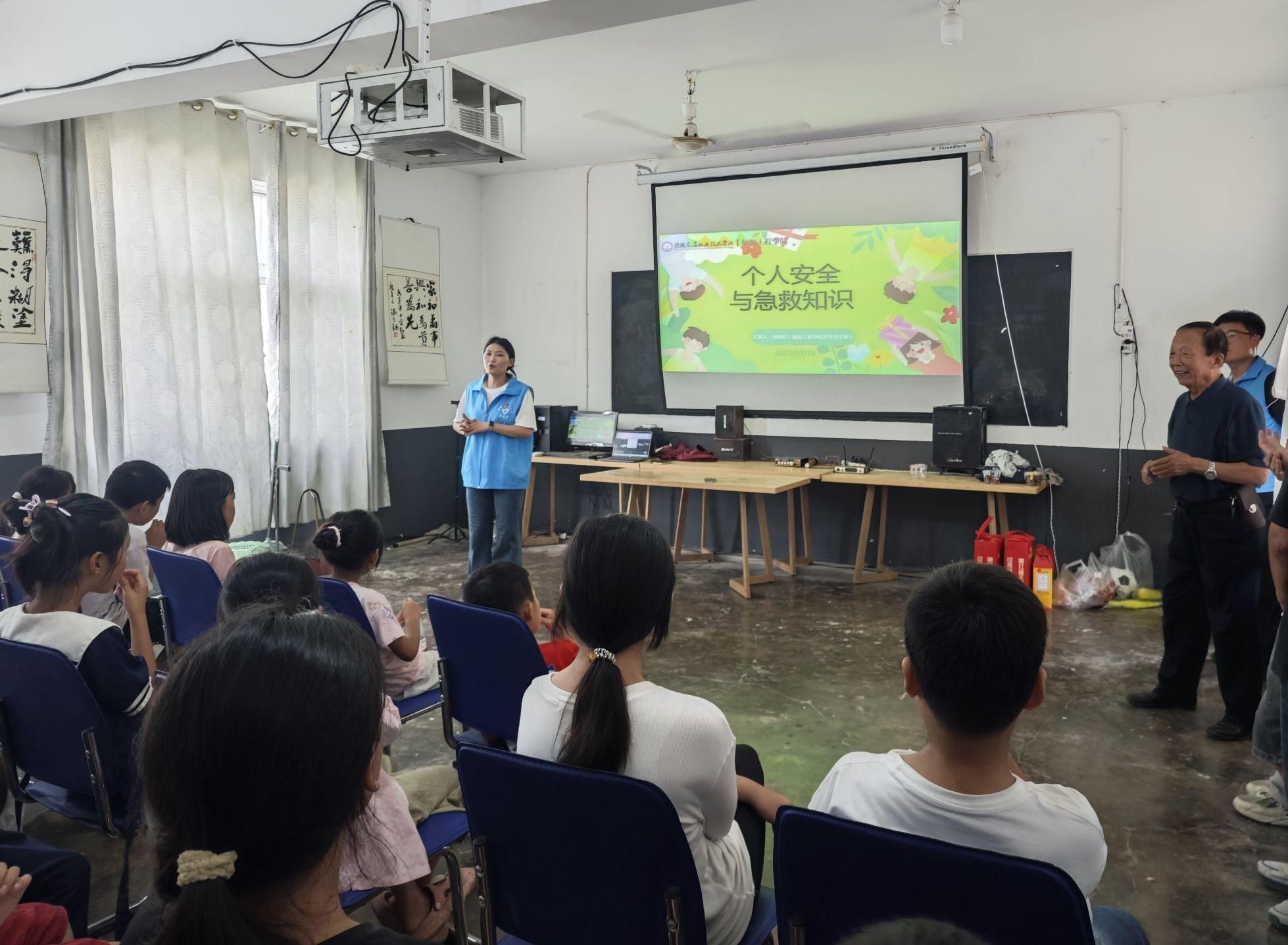 同日下午,针对乡村儿童安全防护需求,学生们利用专业所学急救知识,精心组织个人安全与急救知识教育专项活动。志愿者以“生命至上,安全先行”为理念,通过播放安全教育专题影片、现场示范救生衣规范穿戴流程、详解溺水救援“黄金法则”等方式,系统传授水上安全知识与自救互救技能。安全知识竞赛环节中,孩子们踊跃抢答,将所学知识转化为防护本领,优秀者获颁荣誉奖品,形成了“学安全、懂安全、守安全”的良好氛围,有效提升了乡村儿童的安全防范意识和应急处理能力。