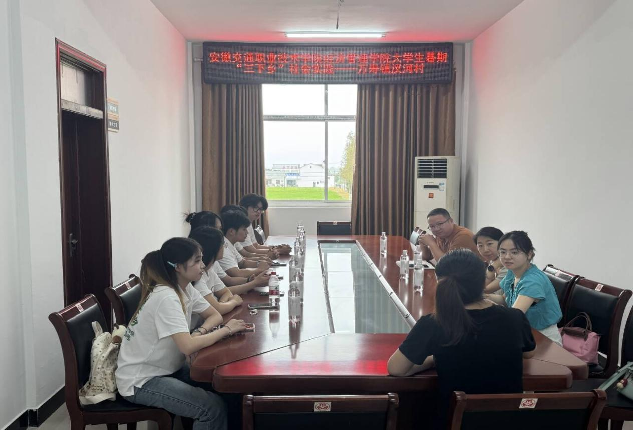 经济管理学院“星火筑梦,电商助农”暑期社会实践团队第一站来到了天长市万寿镇汊河村党群服务中心,受到了汊河村书记董长青和文旅推荐官杨雯等村干部的热情接待。董长青详细介绍了近年来万寿镇汊河村抓住乡土特色,充分利用天长文人香、手工酿造酱园、“天官画”等非物质文化遗产资源,打造了“万寿大米”“九龙口酱油”“万寿桃”等属于自己的特产品牌,实现农业的高质量发展,启动了“文旅融合”乡村振兴的新引擎。