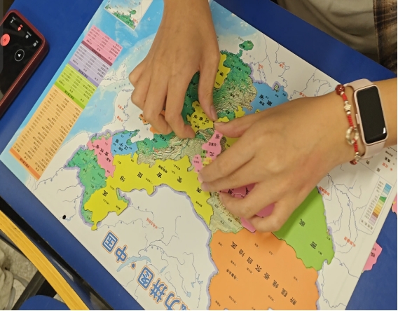 比赛现场,各参赛队伍围绕中国地图拼图展开激烈角逐。选手们手持拼图碎片,在熟悉的省份轮廓与地理标识中快速定位,从“雄鸡”版图的东北一隅到南海诸岛,每一块碎片的精准拼接,都凝聚着对祖国疆域的清晰认知。过程中,有的队伍分工协作、默契配合,快速梳理碎片特征;有的队伍沉着冷静,在细节处反复比对,确保每一寸“国土”都准确归位。当最后一块代表宝岛台湾的拼图嵌入版图,现场响起阵阵掌声,选手们看着完整的中国地图,脸上洋溢着自豪与坚定。