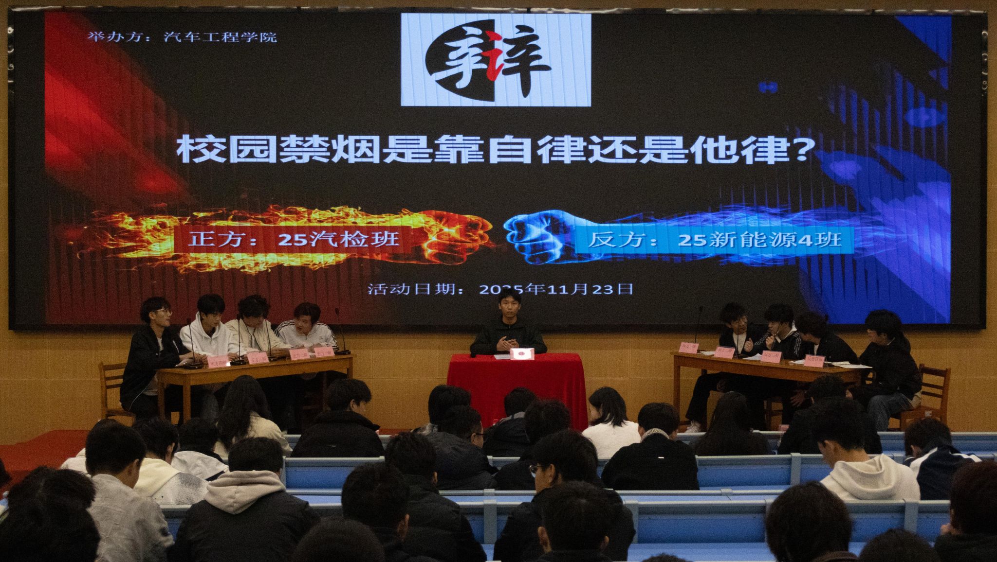 11月23日,汽车工程学院以“校园禁烟是靠自律还是他律”为主题举办辩论赛,围绕校园禁烟工作的核心发力点展开激烈思辨,以思想交锋的形式深化师生对禁烟工作的认知,为推进“无烟校园”建设凝聚共识、汇聚力量。
