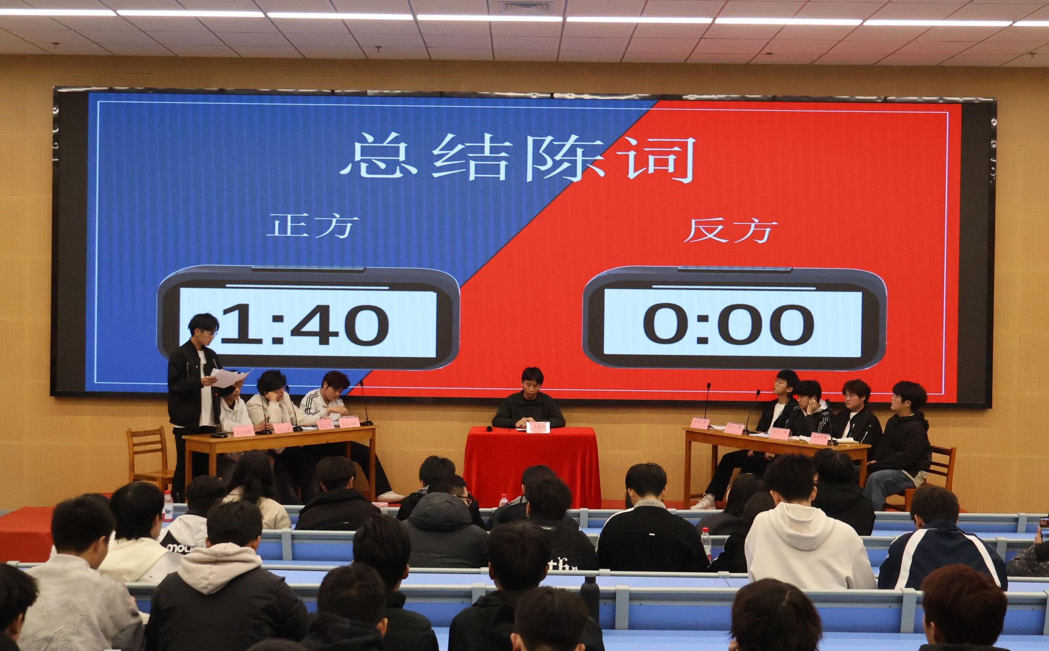 比赛现场,正反双方辩手紧扣辩题,旁征博引、逻辑清晰地阐述观点。正方聚焦“自律”核心,提出个人主观意识觉醒是杜绝校园吸烟行为的根本,唯有树立健康的生活理念、强化自我约束,才能从源头上摒弃吸烟陋习;反方则立足“他律”视角,强调校纪校规的约束、监督机制的完善是校园禁烟的重要保障,只有通过刚性的制度规范和外部监督,才能有效遏制校园吸烟行为。双方在立论、驳论、自由辩论等环节层层推进,精彩的攻防与犀利的言辞赢得现场师生阵阵掌声。