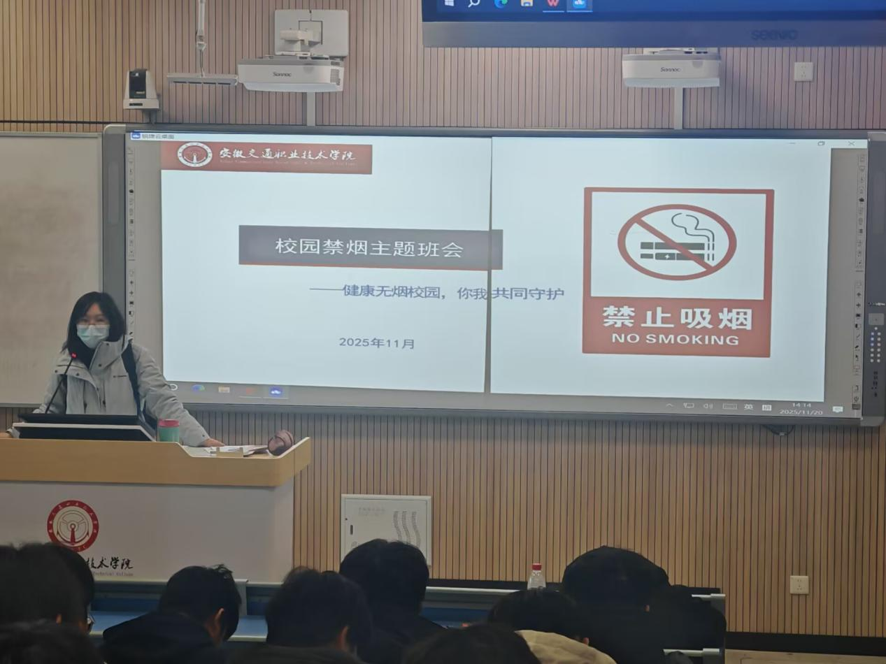思想引领为先,筑牢认知根基。学院各班级全覆盖召开“健康无烟校园,你我共同守护”主题班会,班主任围绕校园禁烟规章制度、烟草对身心健康的危害、违规吸烟处置标准等核心内容进行系统宣讲,通过典型案例剖析、互动问答交流等形式,引导学生深刻认识吸烟的危害性,牢固树立“不吸烟、拒吸二手烟”的自觉意识,凝聚“禁烟护校”思想共识。