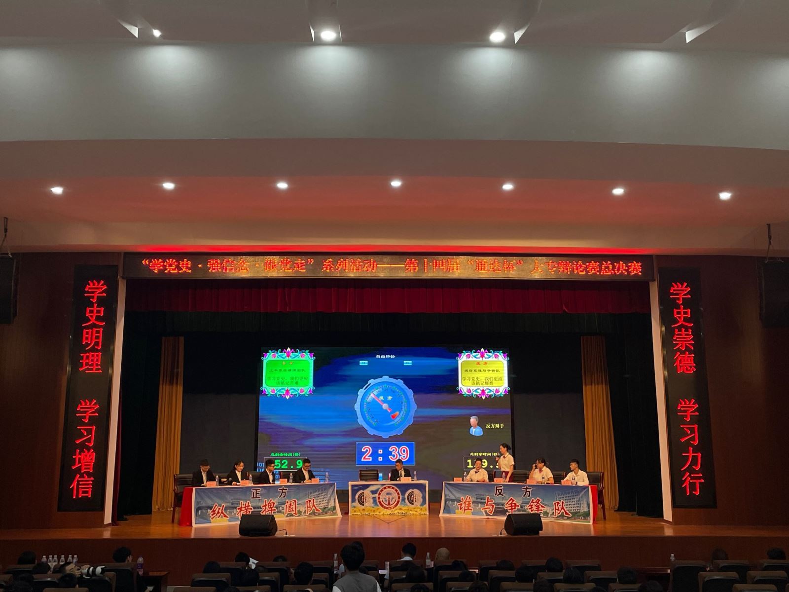 决赛现场气氛活跃,开篇立论环节中,正反双方一辩分别阐述己方观点,正方从铭记建党以来艰苦奋斗攻坚克难的苦难过程这一观点出发引出中国共产党是不是一个从苦难走向辉煌这一问题,从而抛出己方论点。反方一辩则认为铭记辉煌,增强人民对党的信心,比铭记苦难更重要。攻辩和自由辩论环节,正方从苦难的定义和对于苦难造成的消极影响进行驳辫,而反方则针对辉煌的背后是苦难展开精彩辩论,正反双方辩手针锋相对,表现出来的个性风采和整体青春魅力使现场进入到白热化状态,博得了观众们热情的掌声。