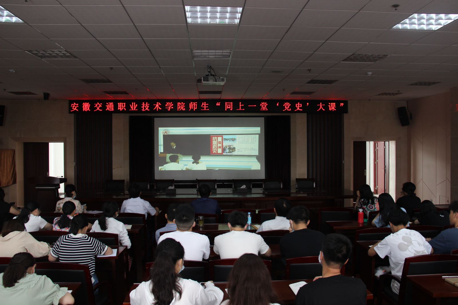 为深入贯彻落实习近平总书记关于深化思想政治理论课改革创新和“大思政课”重要指示批示精神,全面落实习近平总书记在党史学习教育动员大会上的重要讲话精神,6月18日下午,学院组织师生“同上一堂‘党史’大课”,副院长朱文胜、全体专职思政课教师、部分辅导员代表和学生代表共100余人参加集中学习。