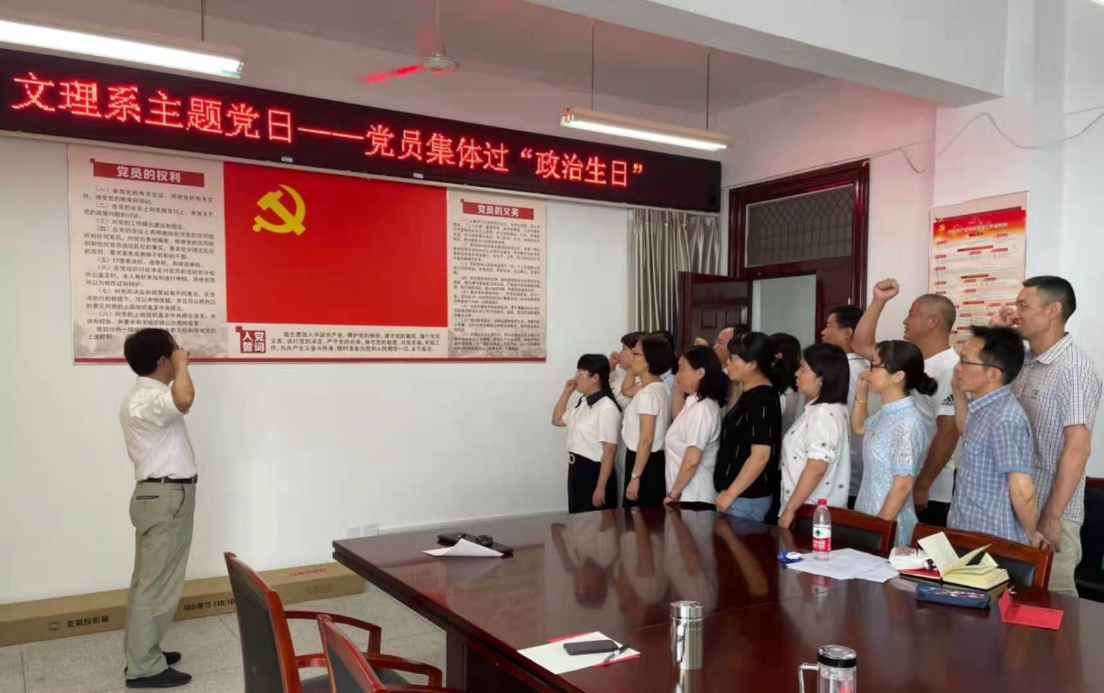 观看庆祝大会活动结束后,在昌希灿的带领下,全体党员重温入党誓词,面对鲜红的党旗,举起右手,紧握拳头,庄严宣誓。各支部书记向每位党员赠送“政治生日”贺卡,与会党员共同度过了一次难忘的政治生日。大家纷纷表示,这是一次很好的党性教育课,进一步激发了爱党爱国意识,自己有责任有义务做好教书育人工作。(文理系 江心培)