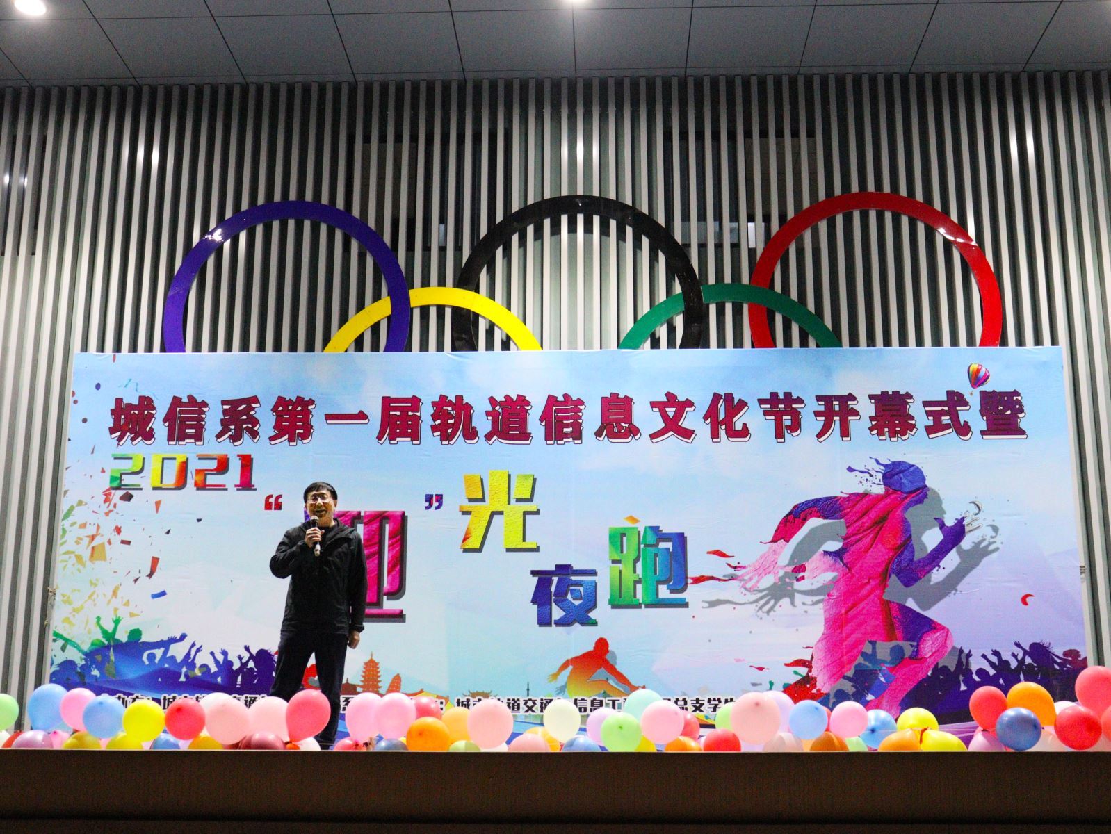 王丰胜为本次文化节开幕式活动致辞,他指出,此次轨道信息文化节暨“迎”光夜跑活动以独特的方式为党的一百周年华诞献上了一份特殊的礼物。他呼吁广大同学“走出宿舍、走下网络、走向操场”,通过本次“迎”光夜跑活动,全面打造自身在“德、智、体、美、劳”等各方面的综合发展,以自身实际行动深入践行社会主义核心价值观,全面弘扬中华民族传统文化,为把自己培养成为新时代中国特色社会主义建设事业所需的合格高技能人才而不懈努力。