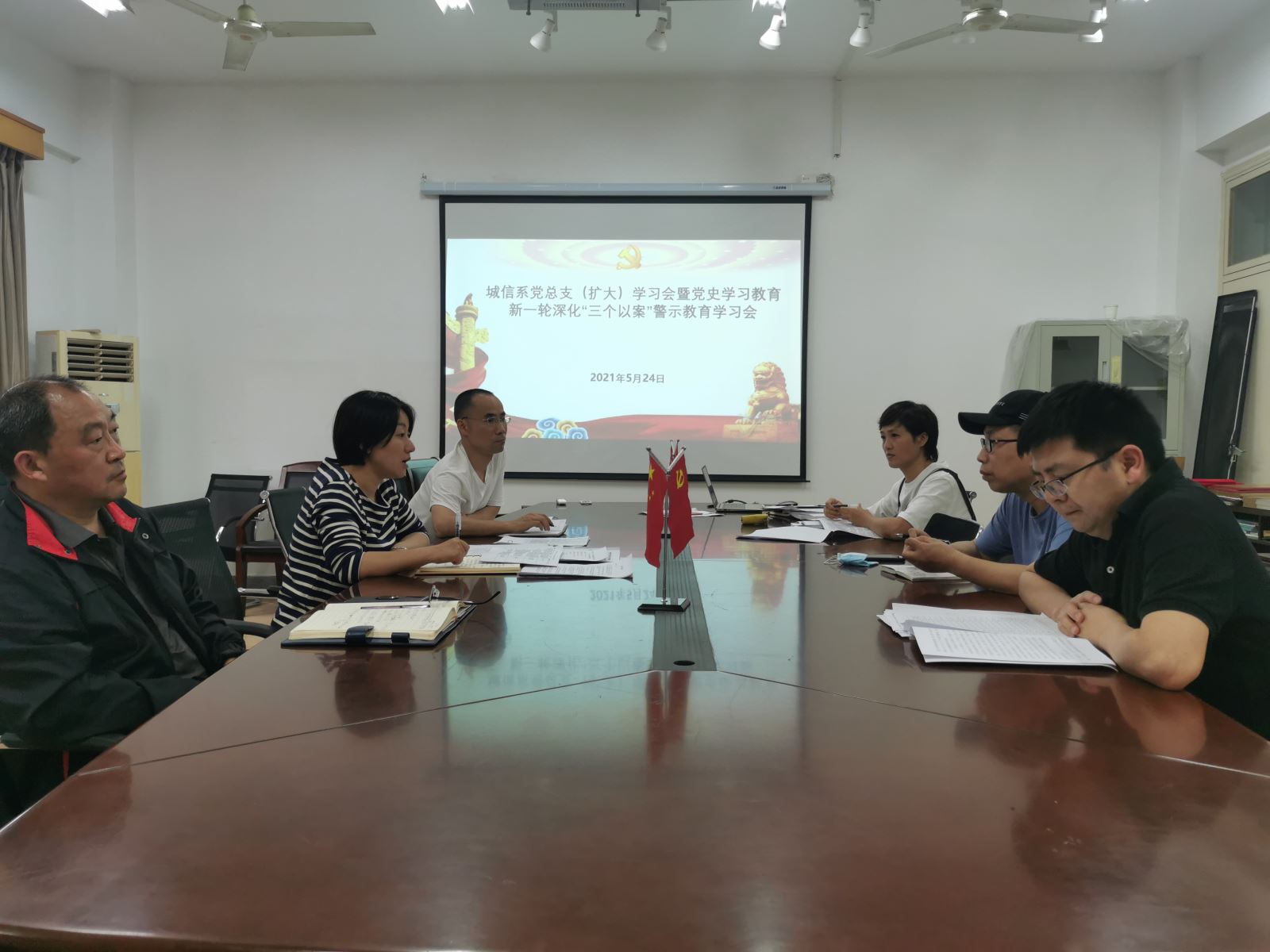 5月24日下午,城信系召开党总支中心组(扩大)学习会暨党史学习教育、新一轮深化“三个以案”警示教育学习会。系党总支书记汪倩主持会议,系党总支委员、各支部书记参会。