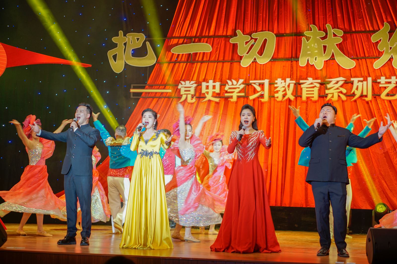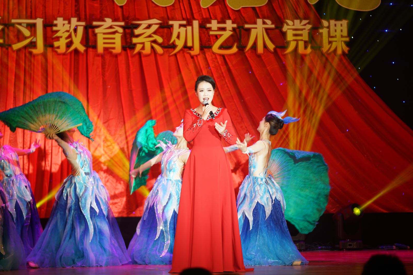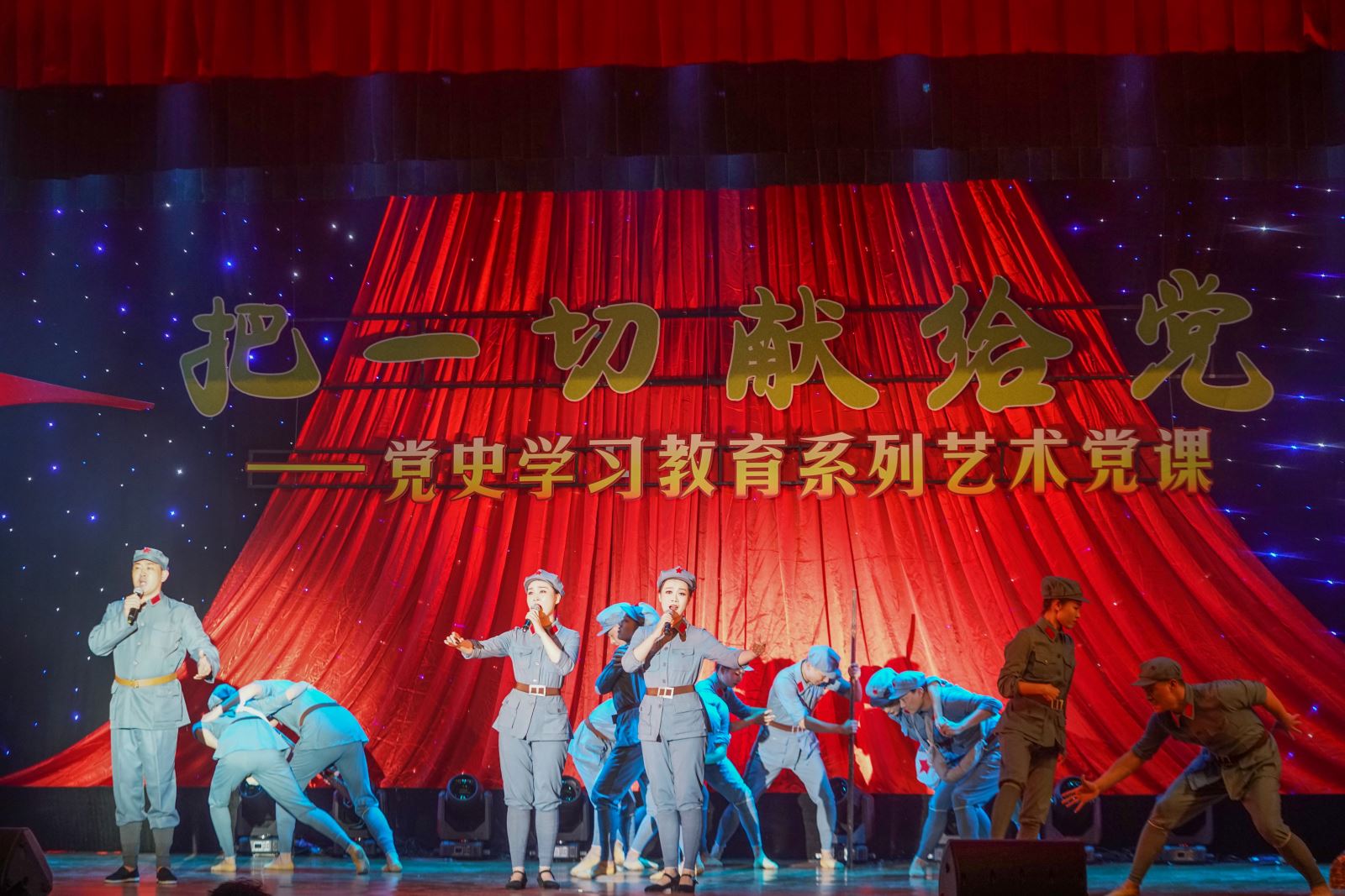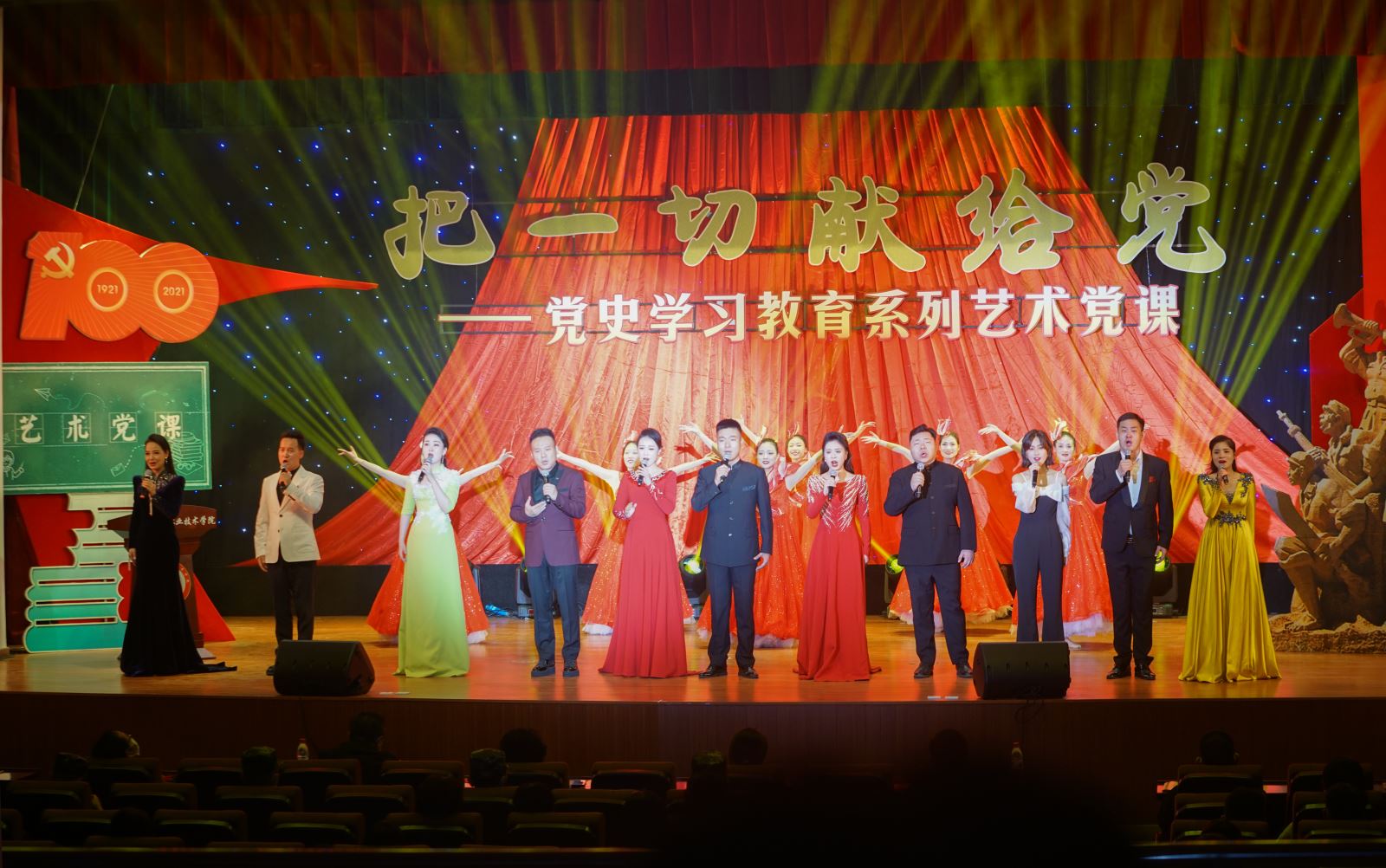 安徽省歌舞剧院给学院师生带来了一生动的艺术党课,通过歌曲、舞蹈等形式,回顾革命先辈的丰功伟绩,追忆艰难岁月的奋斗历程,重温那段难忘的峥嵘岁月。演出以中国共产党百年来的革命、建设、改革为主线,遴选了《保卫黄河》《春天的故事》《百年征程》等一首首脍炙人口的歌曲,融入情境表演、舞蹈等多种呈现形式。歌舞剧院演艺的三首全省党政机关原创歌曲《信仰到永远》等,生动展现了党的奋斗历程和伟大成就,更是将全场观众的热情推向高潮。整场文艺演出在跳动的音符中穿梭百年征程,回顾中国共产党的光辉历史,激励广大党员和团员青年筑牢爱党爱国的“根”和“魂”,在学思践悟中坚定理想信念,在奋发有为中践行初心使命。演出尾声,全体演职人员和现场观众共同高唱《没有共产党就没有新中国》,嘹亮的歌声在礼堂回荡,激扬的旋律催人奋进。