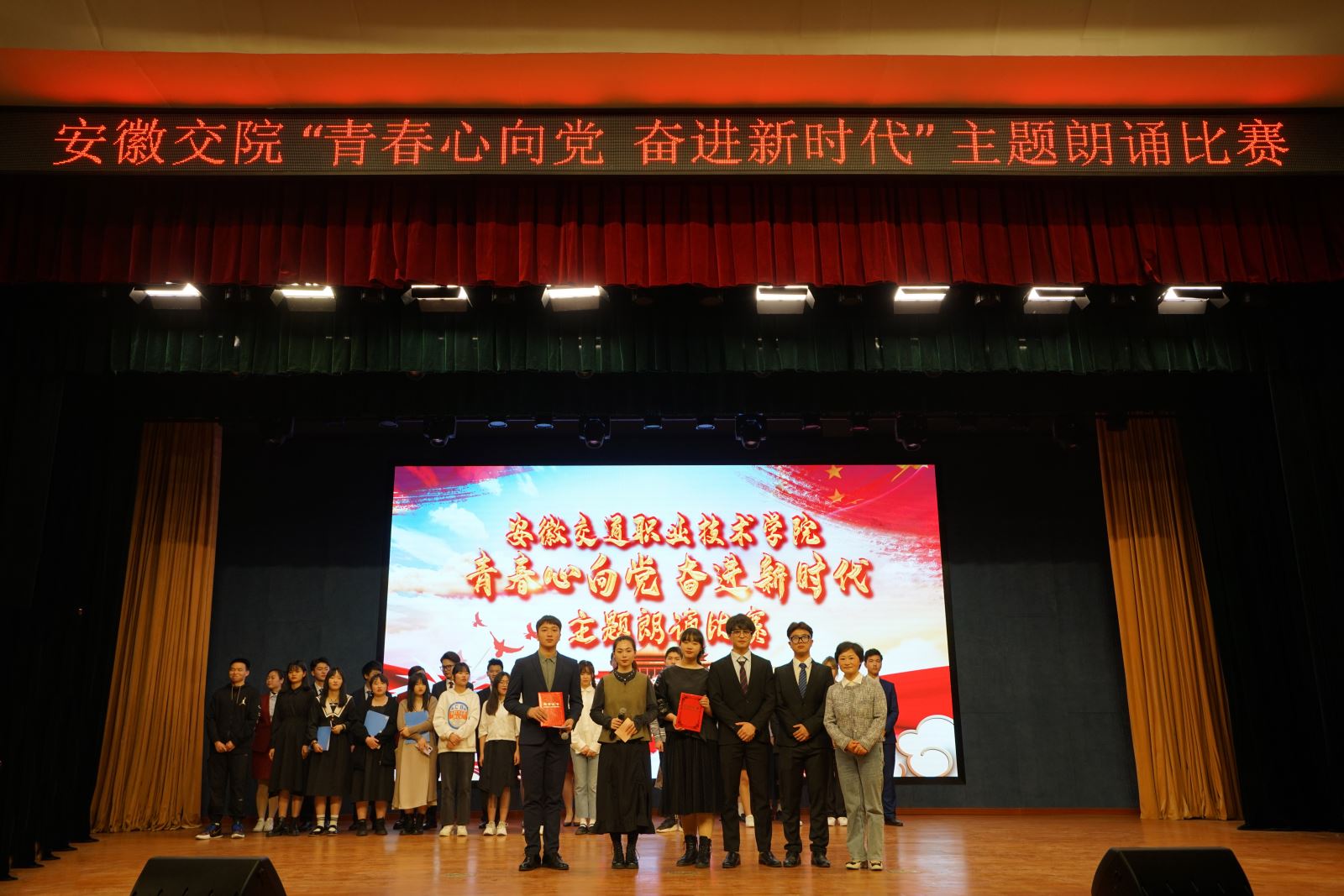 为纪念中国共产党成立100周年,进一步引导广大青年更加热爱党、拥护党,落实共青团“学党史、强信念、跟党走”学习教育安排部署,4月24日晚,学院在南区大礼堂举办了“青春心向党,奋进新时代”经典诵读比赛。安徽广播影视职业学院播音主持专业副教授余涓,安徽广播电视台安徽之声主持人杨坤,安徽省演讲学会副秘书长陈瑞鹏应邀担任评委。比赛最终评出一等奖三名,二等奖五名,三等奖九名。