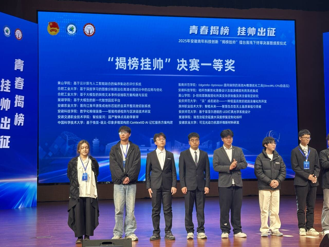 2025年安徽青年科技创新“揭榜挂帅”擂台赛决赛在合肥圆满落下帷幕。本次决赛共有 55 支队伍入围,其中有中国科技大学、合肥工业大学等49 支本科院校队伍和 6 支专科院校队伍。在这场与众多高水平院校同台竞技的省级高规格赛事中,米兰milan官方网站人工智能学院师生团队表现卓越,一举斩获一项一等奖和一项二等奖的优异成绩。