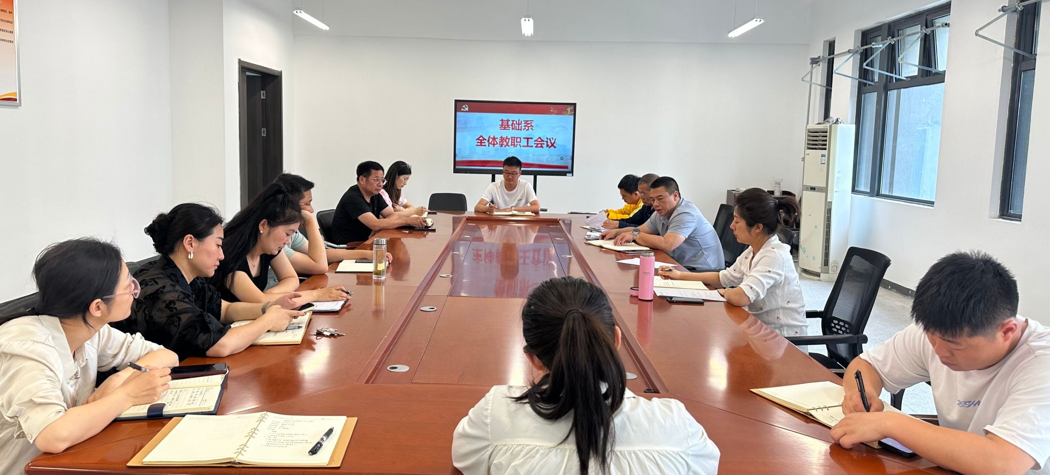 5月27日下午,基础系召开全体教职工政治理论学习会,系党总支书记胡冰主持会议,全体教职工参加。