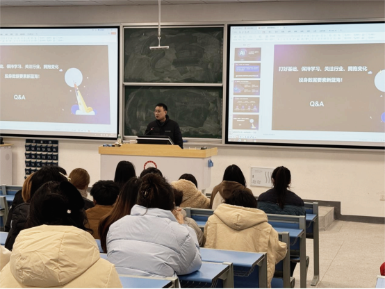 针对大数据专业学生,张春特别介绍了图联科技在财经、智慧工业等垂直领域的数据标注与AI训练数据服务业务,并与学生就业方向紧密结合。他鼓励学生在校期间夯实数据处理基础,积极学习AI相关知识,关注行业动态,提前规划职业生涯。