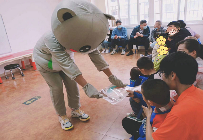参观学习之后,师生走进康复课堂,与儿童互动。为了让特殊儿童感受到更多的温暖和关爱,学生们穿上可爱的玩偶服,带领儿童做游戏。党员教师也加入课堂教学,与儿童一起做手工,玩游戏,辅助特教老师完成教学任务。