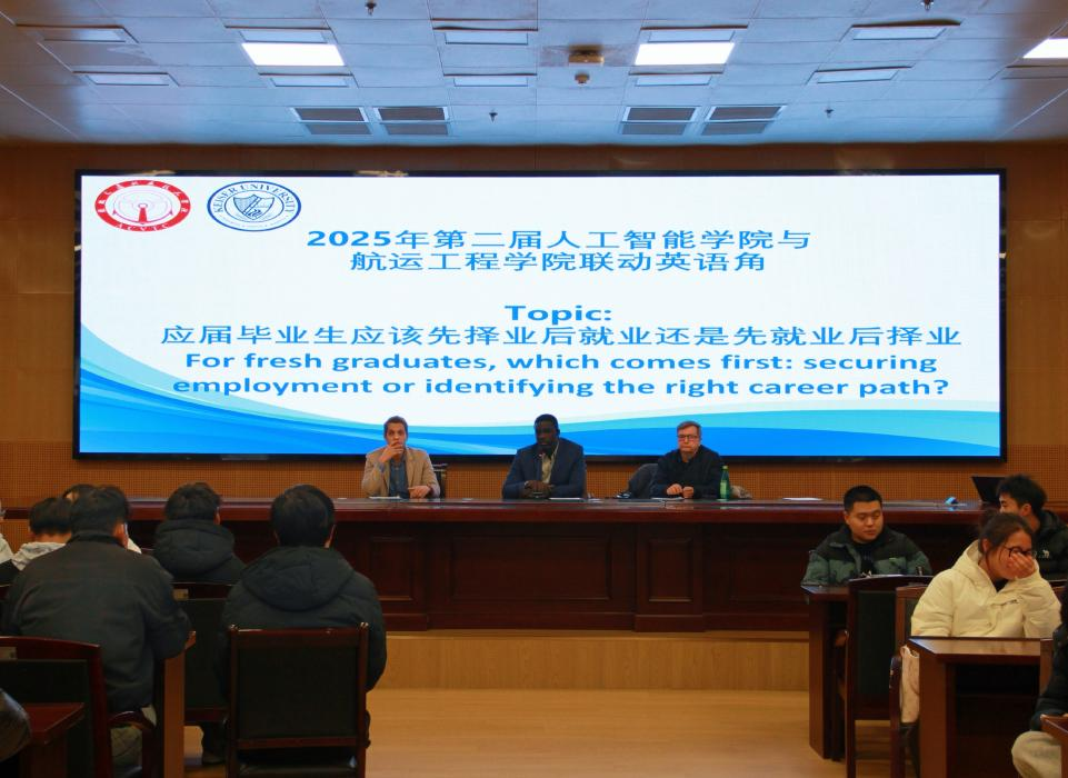 2025年12月24日中午,由米兰人工智能学院与航运工程学院联合举办的第二届英语角辩论赛在综合楼11楼会议室成功举办。本次辩论赛以“应届毕业生应先就业后择业还是先择业后就业”为辩题,吸引两院80名学生积极参与,特邀外教Jack、Dadras、Ismael担任评委。