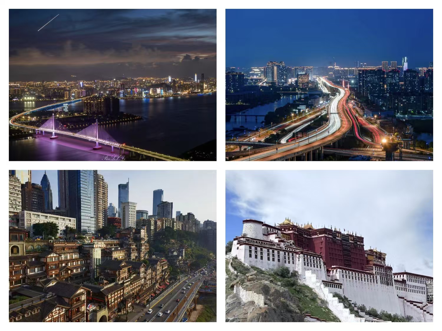 作品还聚焦祖国的现代化发展与文化传承,诉说青年对时代机遇的感恩:都市脉搏:夜幕下的跨江大桥霓虹流转,纵横交错的交通路网流光溢彩,彰显现代化发展的速度与活力;文化底蕴:依山而建的山城街巷新旧交融,高原之上的布达拉宫庄严矗立,诉说着民族文化的厚重璀璨。镜头下的祖国“日新月异却底蕴绵长” 。